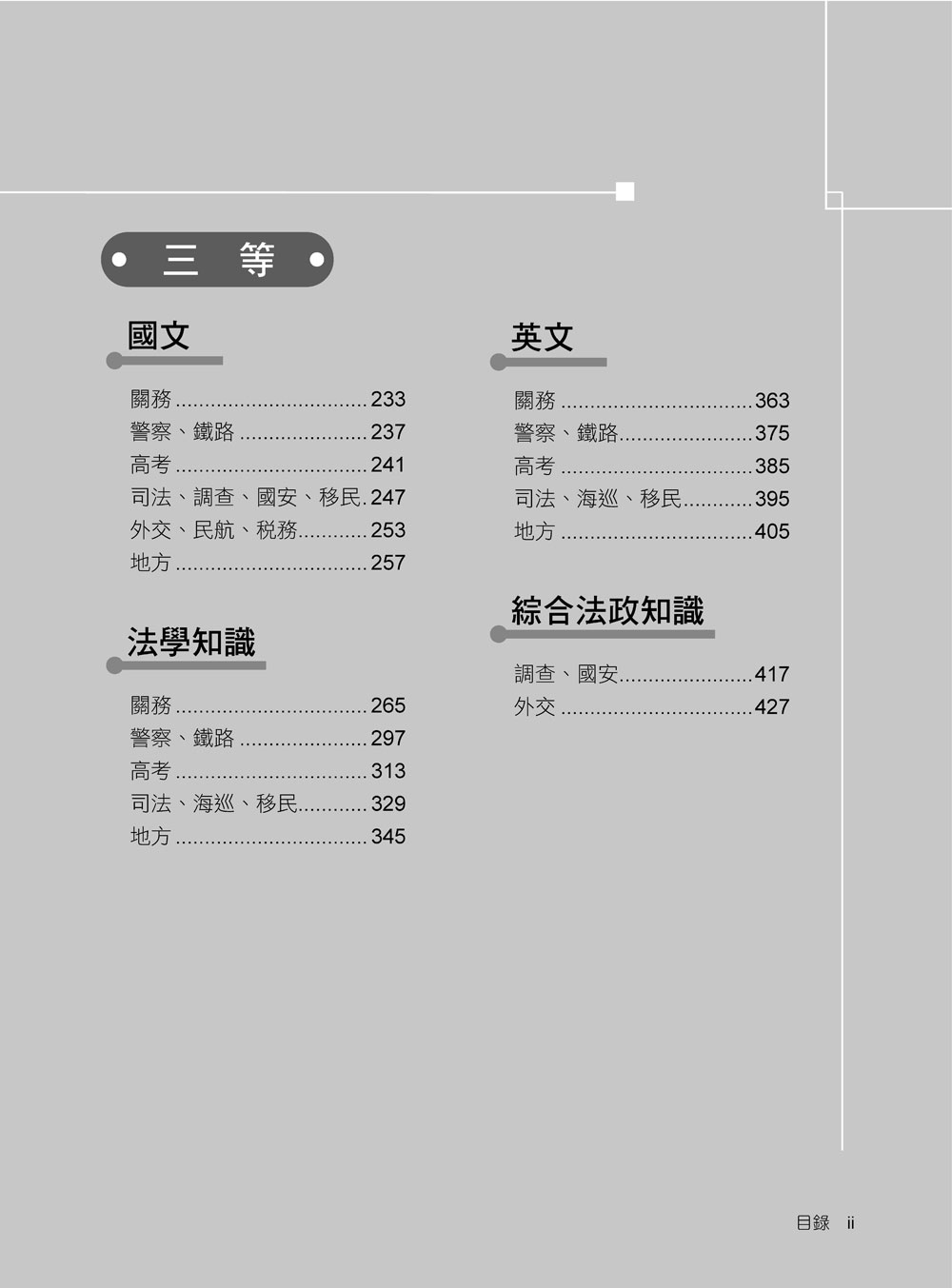 本書收錄科目包含:國文、法學知識、英文、綜合法政知識。