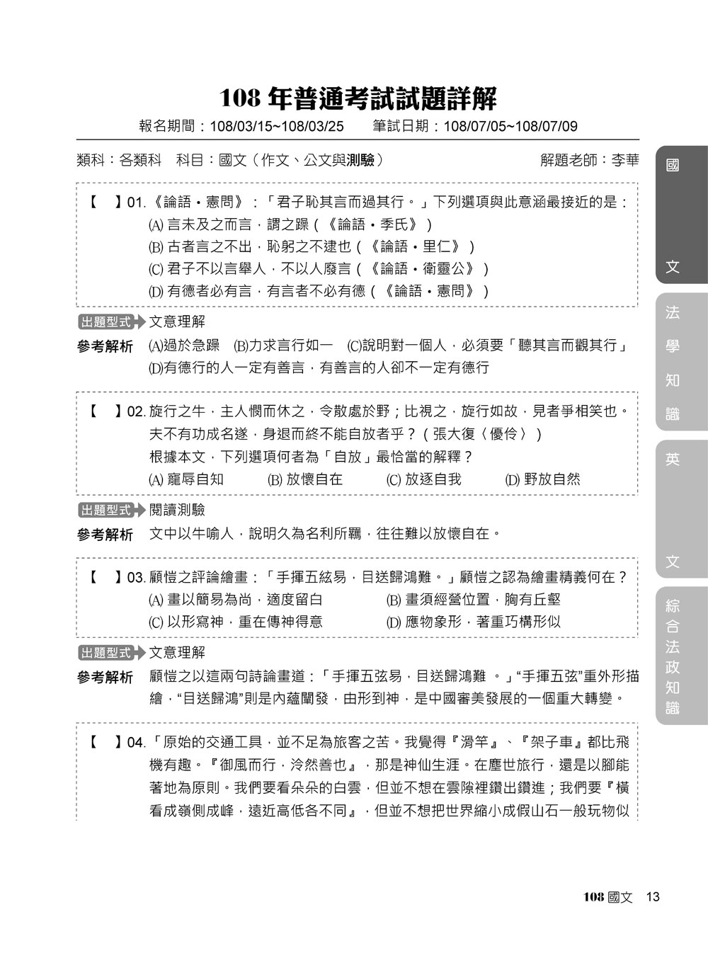 本書收錄公職考試【普通科目】108年(測驗題)試題詳解,幫助您一次準備全面應戰、協助您熟悉題型順利上榜。