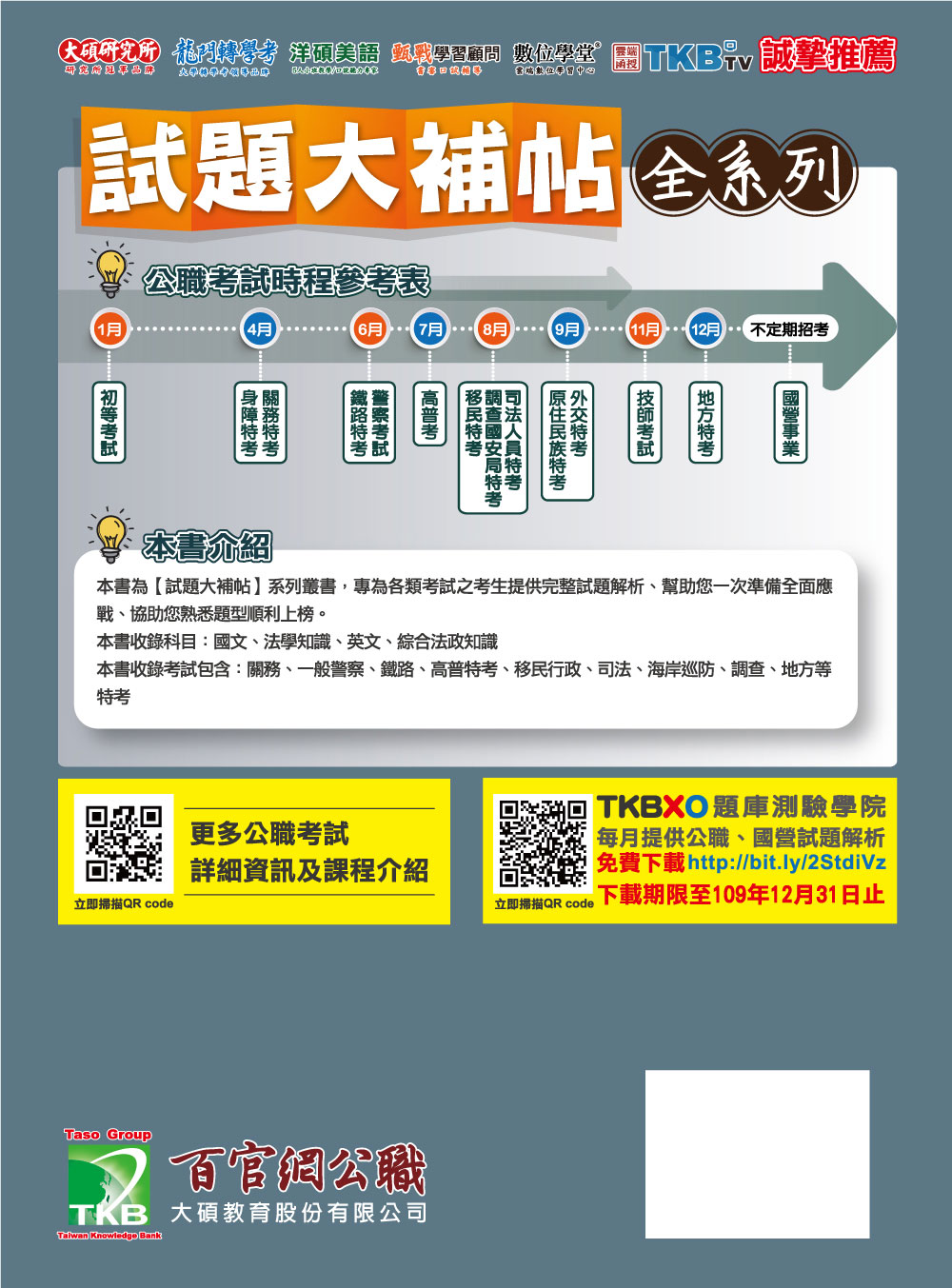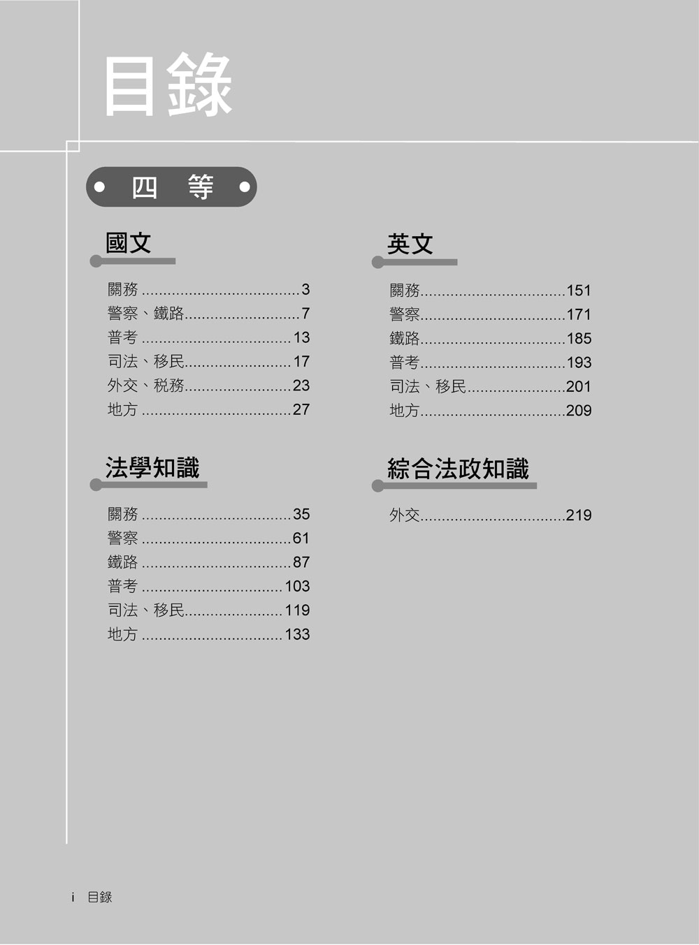 本書收錄考試包含:關務、一般警察、鐵路、高普特考、調查、國安、司法、外交、民航、稅務、司法、海巡、地方等特考。
