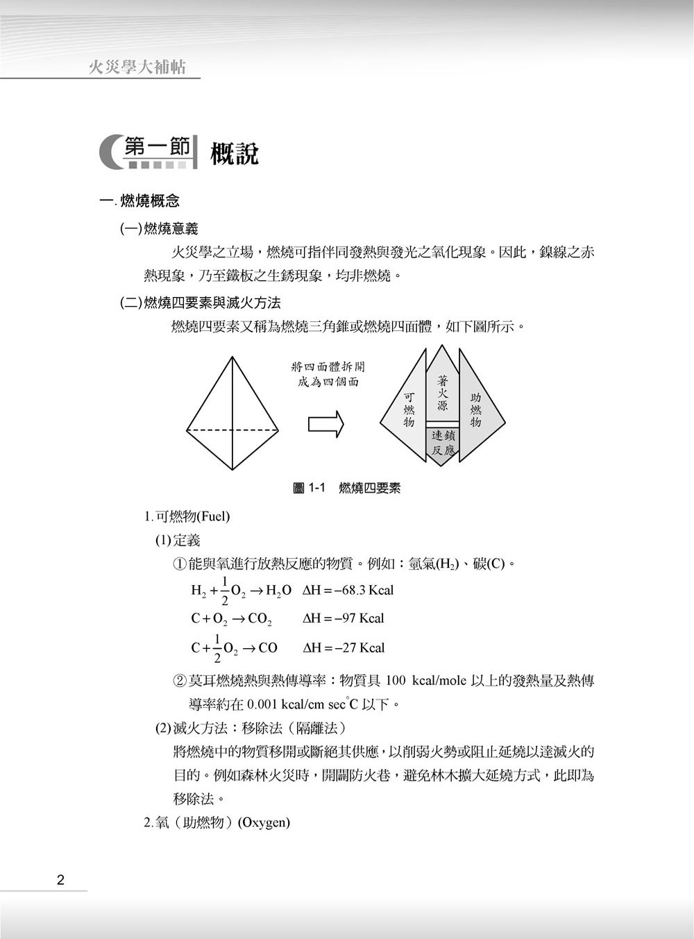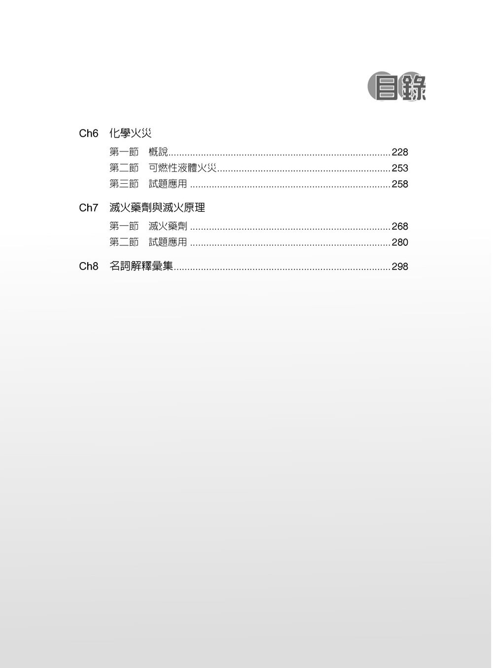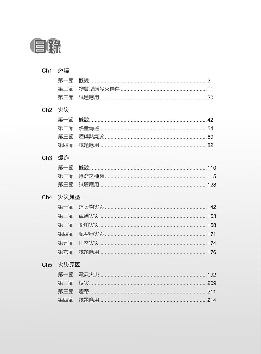 本書內容編排依序為:燃燒、火災、爆炸、火災類型、火災原因、化學火災及滅火藥劑與滅火原理七個章節主題內容,每一章節內容則包含了申論、計算及選擇題等三大題型,另為方便讀者在短時間內能複習相關名詞意義,特編寫了第八章「名詞解釋彙集」。對於原文名詞定義及中文用語,則參考了「國家教育研究院雙語辭彙、學術名詞暨詞書資訊網」、「教育部實驗室環保安全衛生網」、內政部消防署及國內眾多學者的見解。