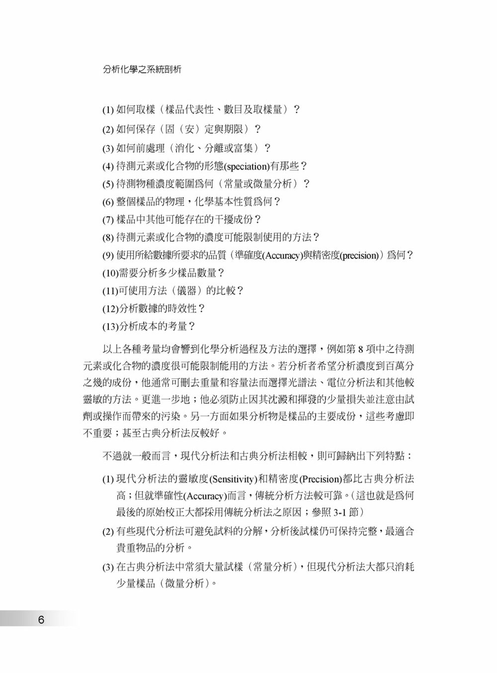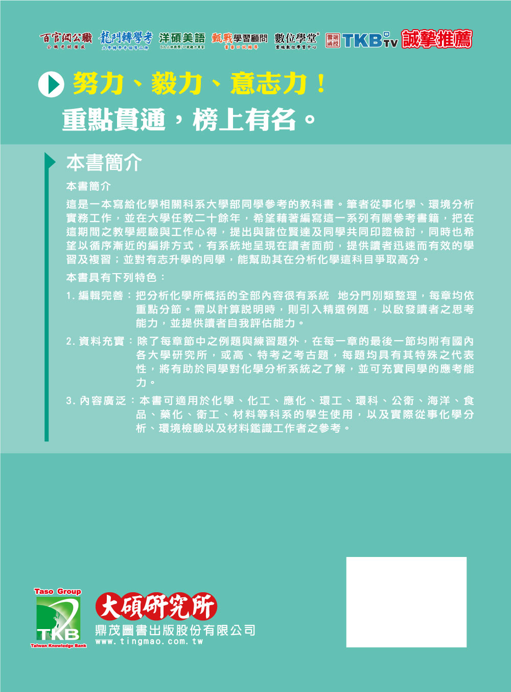 3.內容廣泛:本書可適用於化學、化工、應化、環工、環科、公衛、海洋、食品、藥化、衛工、材料等科系的學生使用,以及實際從事化學分析、環境檢驗以及材料鑑識工作者之參考。