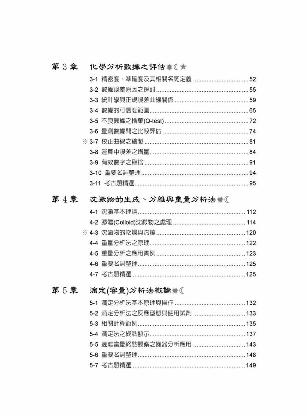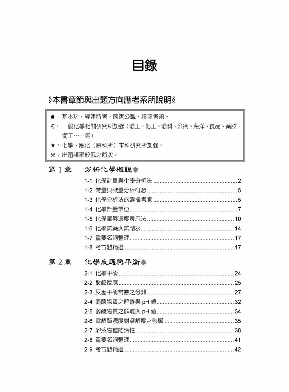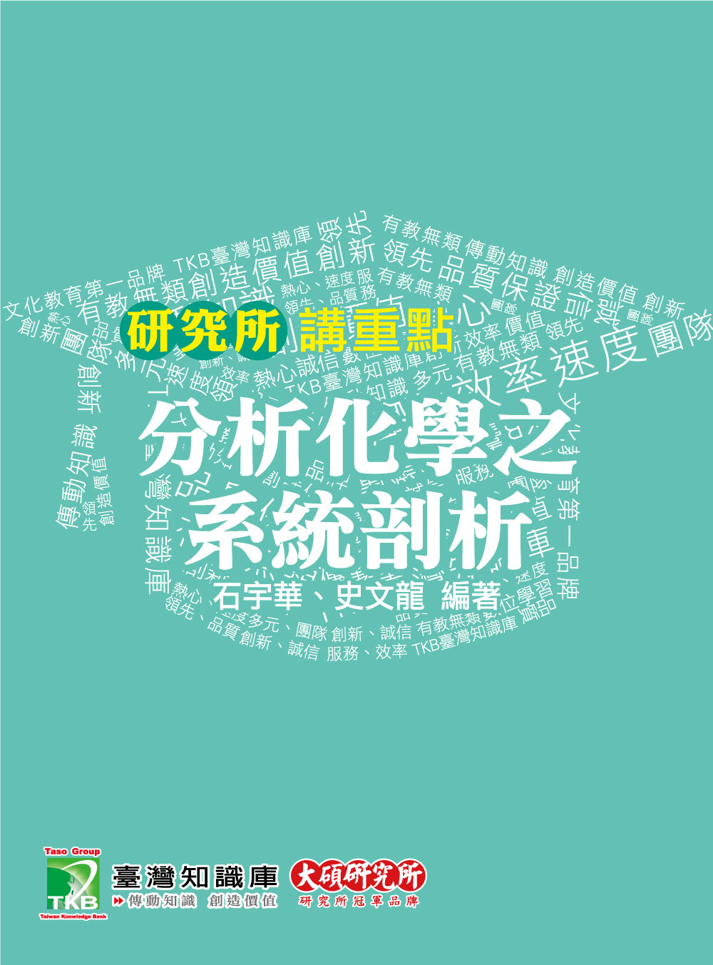2.資料充實:除了每章節中之例題與練習題外,在每一章的最後一節均附有國內各大學研究所,或高、特考之考古題,每題均具有其特殊之代表性,將有助於同學對化學分析系統之了解,並可充實同學的應考能力。