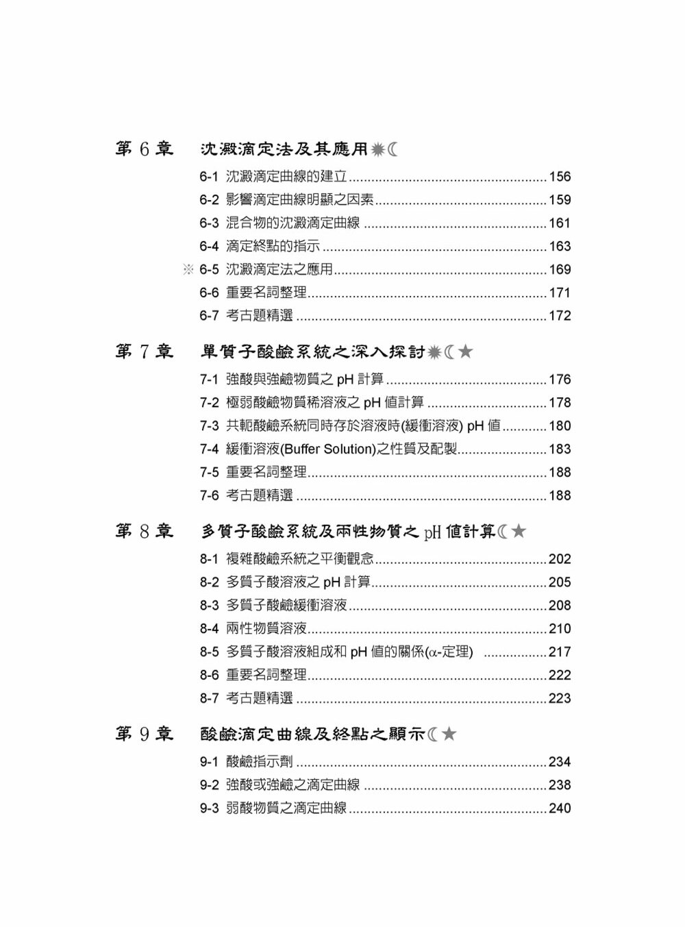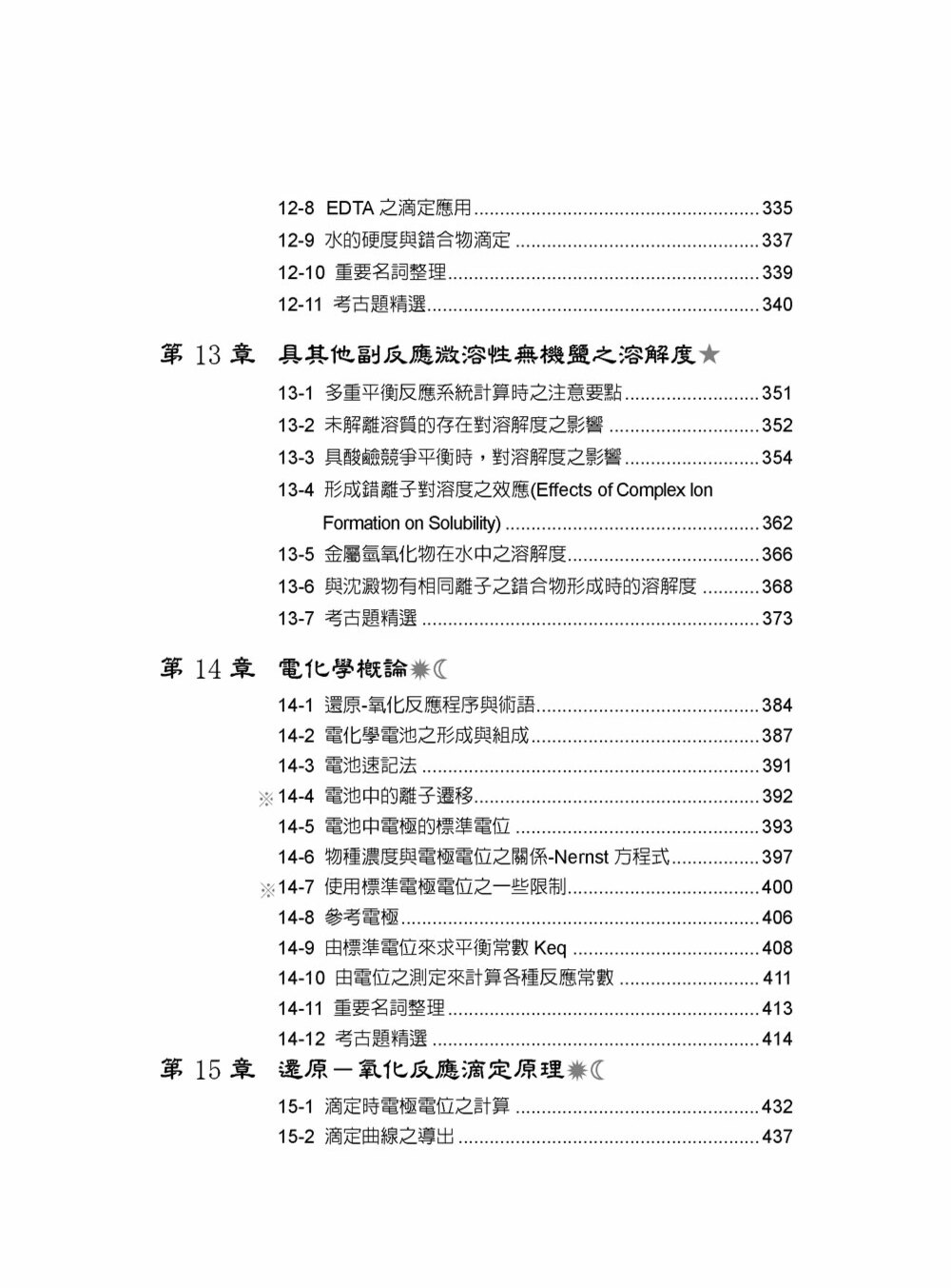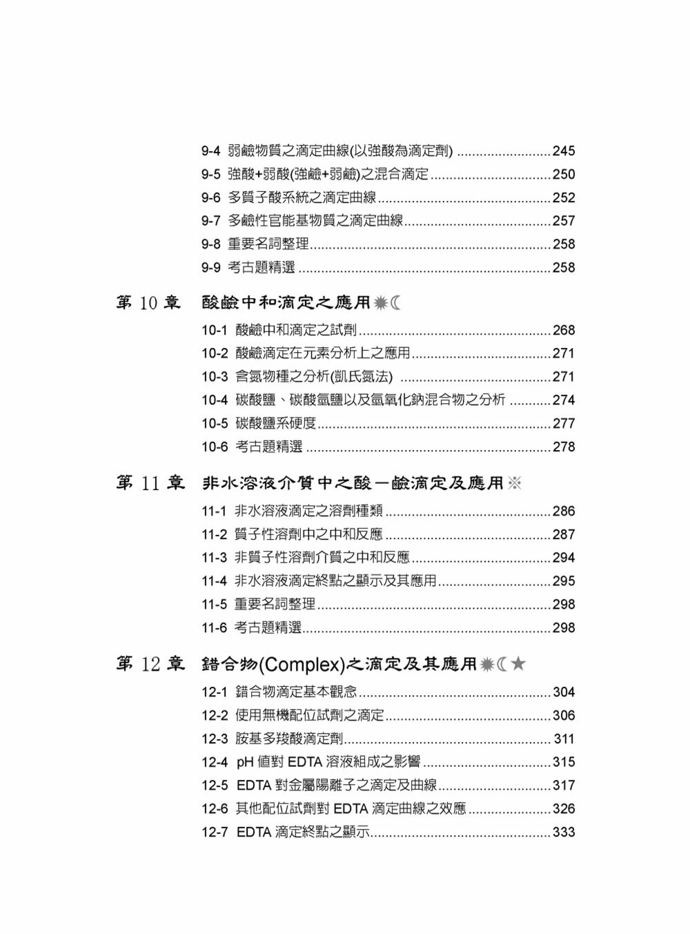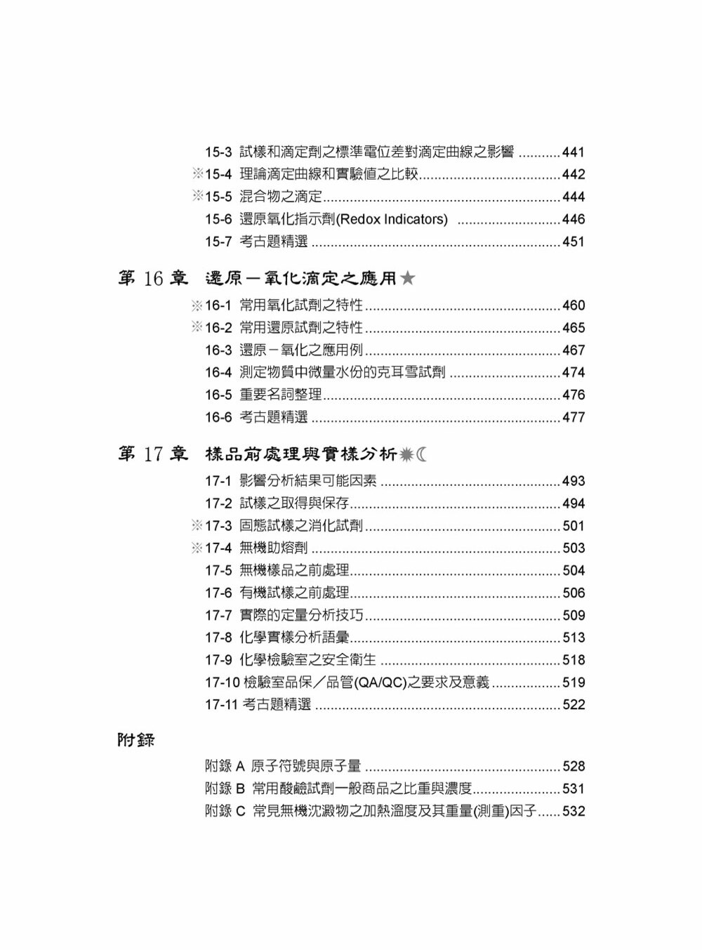 2.資料充實:除了每章節中之例題與練習題外,在每一章的最後一節均附有國內各大學研究所,或高、特考之考古題,每題均具有其特殊之代表性,將有助於同學對化學分析系統之了解,並可充實同學的應考能力。
