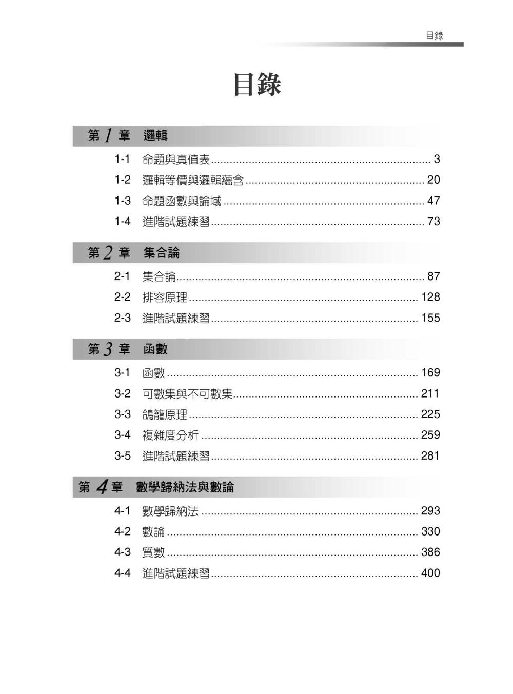 本書收錄國內各大學研究所與各系聖經本教材的離散數學試題,為筆者任教二十年的授課教材。書中將離散數學各主題,搭配重點常考題目分類編排,為同學準備研究所升學考試、校內課程輔助學習的最佳工具。