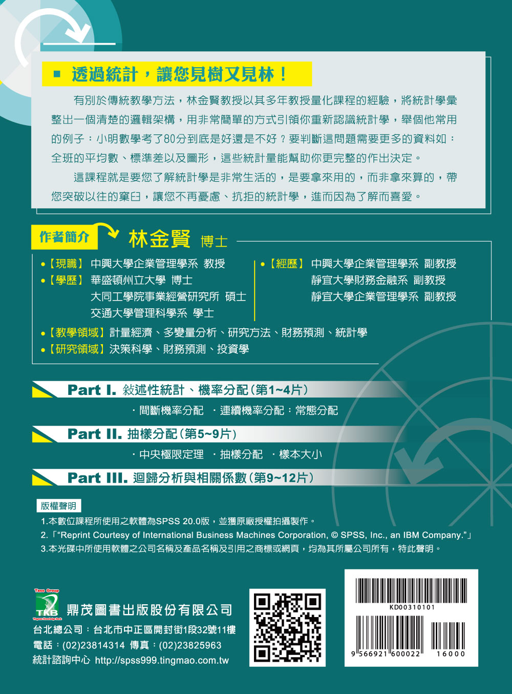 有別於傳統教學方法,林金賢教授以其多年教授量化課程的經驗,將統計學彙整出一個清楚的邏輯架構,用非常簡單的方式引領你重新認識統計學,舉個他常用的例子:小明數學考了80分到底是好還是不好?要判斷這問題需要更多的資料如:全班的平均數、標準差以及圖形,這些統計量能幫助你更完整的作出決定。