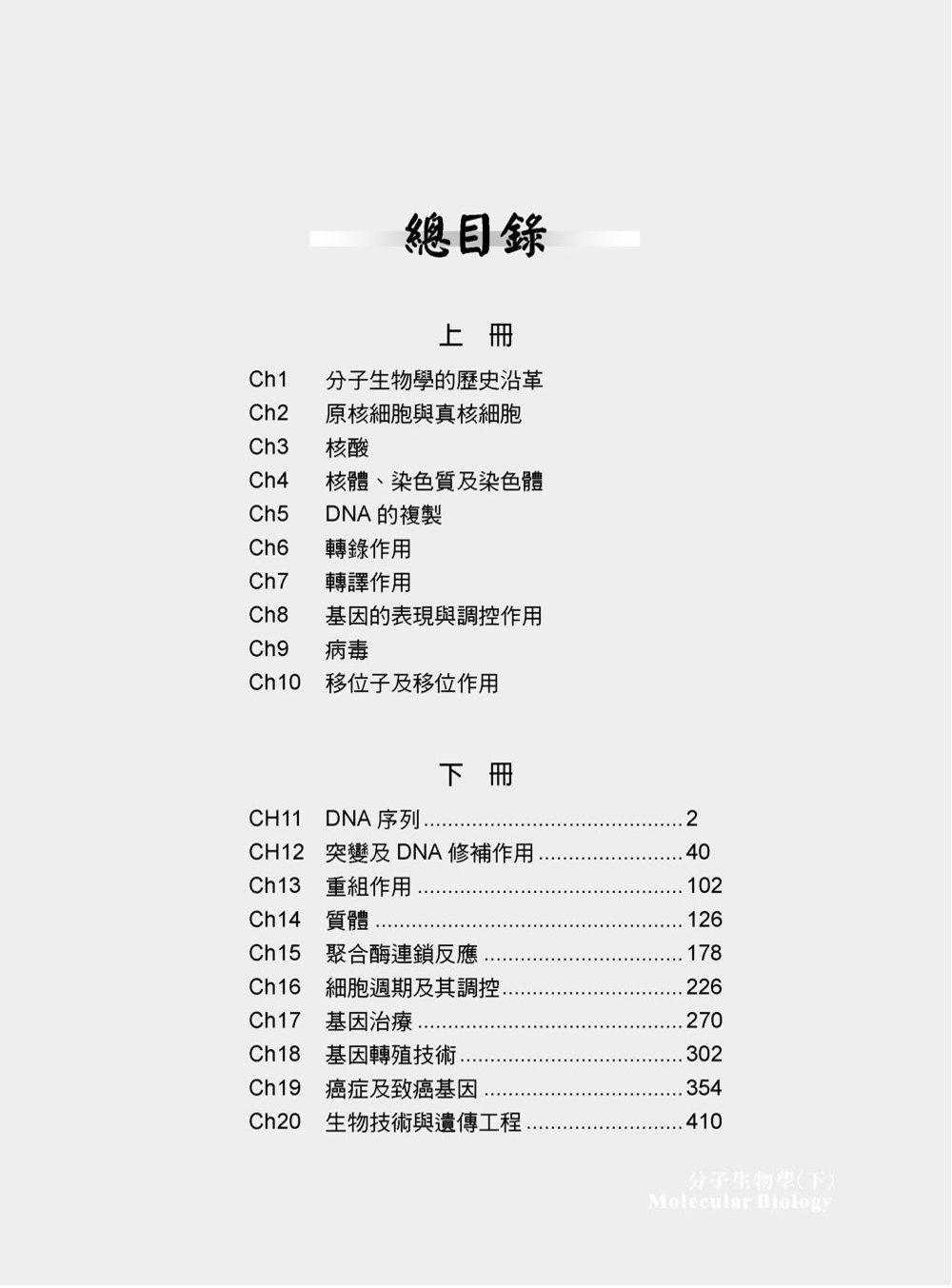 本書除參考多本各校所常使用的分子生物學教科書外,其中內容的編排也盡可能的條列化、清楚化,以達深入淺出的目的,而且為避免同學失去接觸原文的練習機會,本書也盡可能在相關內容處增放「原文閱讀訓練」單元,以期同學能在讀完每一章節後,能藉由研讀相關的原文內容,而對該章節所授之內容有再次複習的機會,並同時增加原文的閱讀能力,相信本書豐富的內容及詳盡的說明必可對正在準備分子生物學相關考試的莘莘學子有所助益。