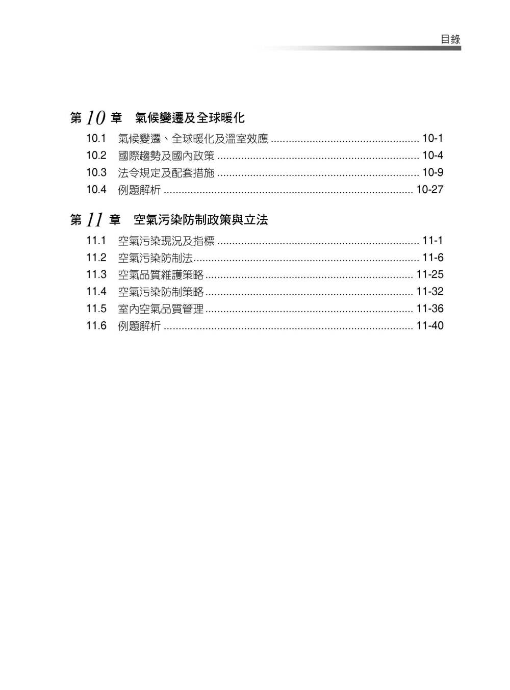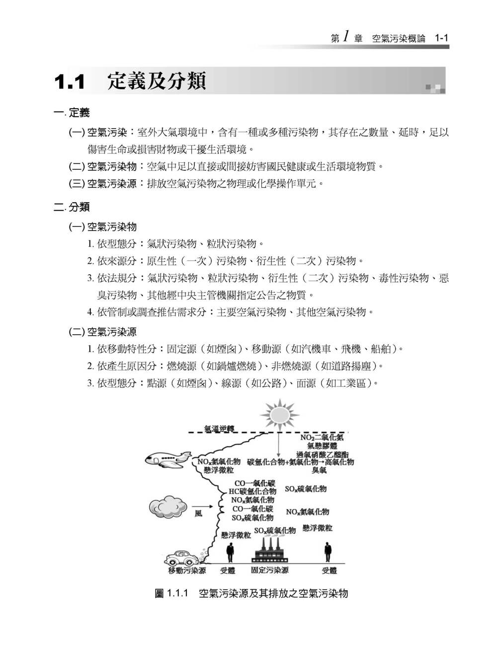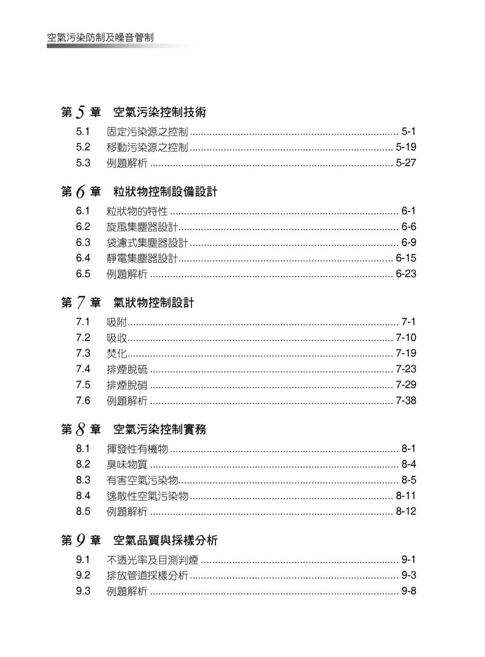 本書內容於「空氣污染控制」部分共分為11章,第1~4章為基礎篇章,旨在建立讀者對於空氣污染之成因、種類及影響等基本認知;第5~8章為應用技術篇章,旨在瞭解及學習各種空氣污染控制技術之原理及設計應用;第9~11章為行政管制篇章,旨在瞭解空氣污染物採樣檢測之重點及代表性,以及溫室效應、室內外空氣污染等大氣環境議題之相關政策方向與立法管制重點。
