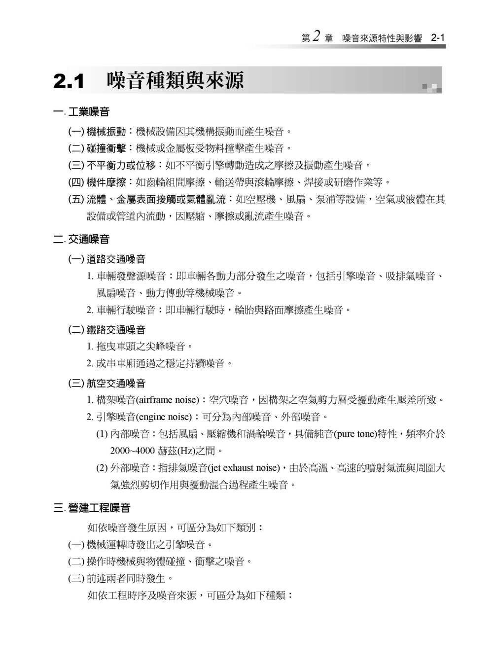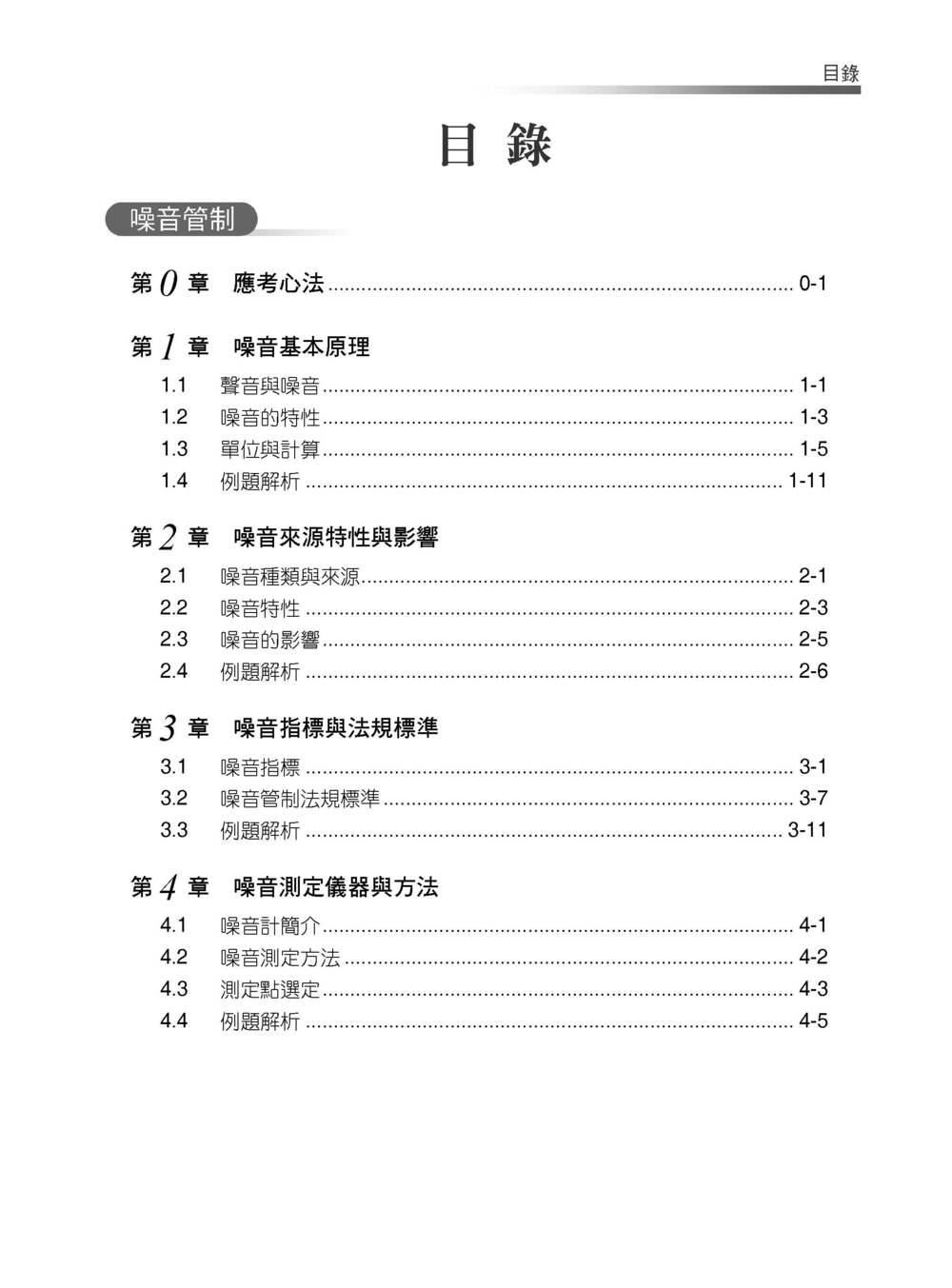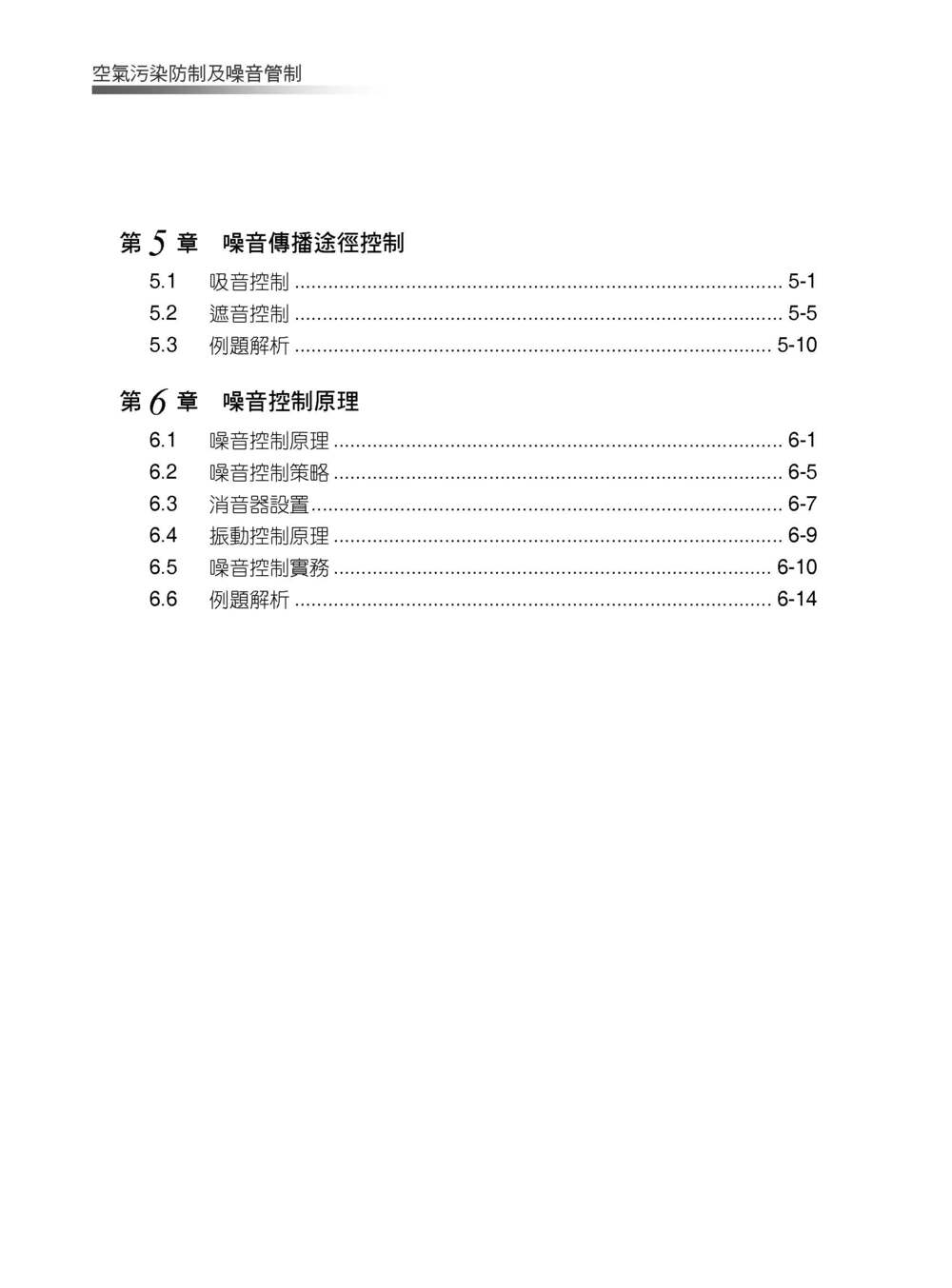 「噪音管制」部分共分為6章,第1~2章為基礎篇章,旨在建立讀者對於噪音之成因、定義及來源與對人體影響等基本認知;第3~4章為行政管制篇章,旨在瞭解各類噪音採樣檢測之方式及代表性,以及噪音管制相關法規標準內容重點;第5~6章為應用技術篇章,旨在瞭解及學習各種噪音問題改善原理及控制技術。