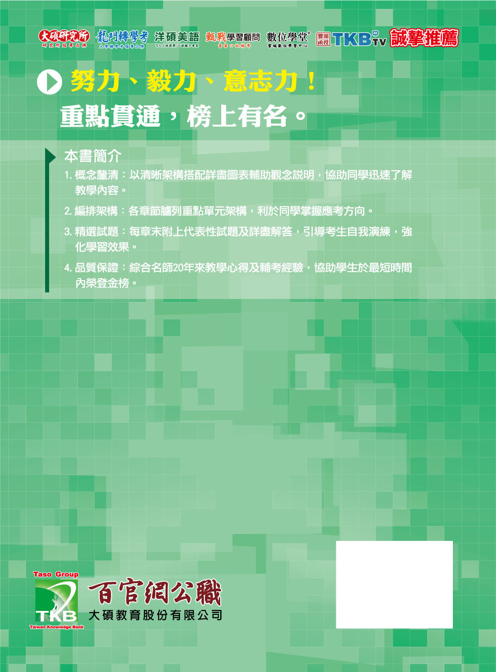 2.編排架構:各章節臚列重點單元架構,利於同學掌握應考方向。