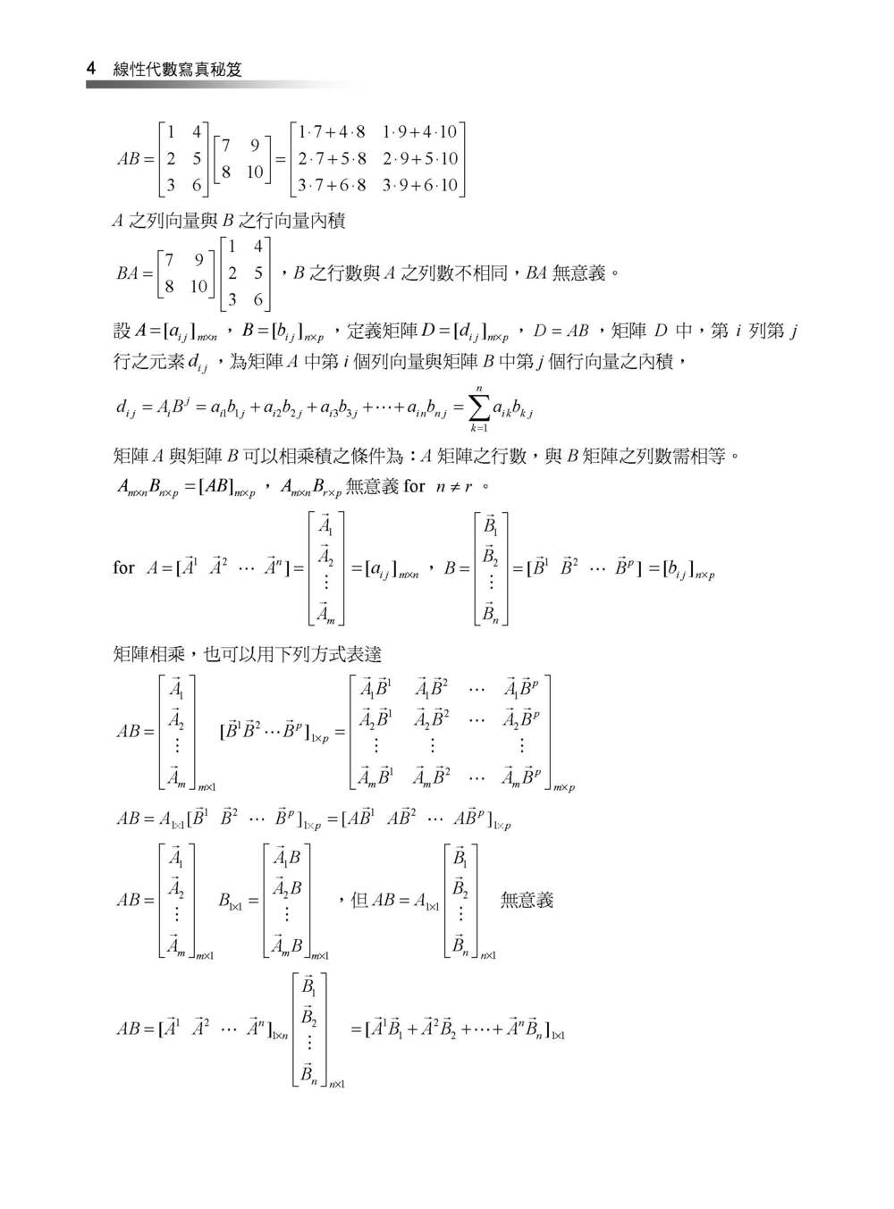 很多同學對線性代數懷有恐懼感,那是因為不甚瞭解,觀念不清楚所致,只好以死背方式,背了很多計算題與證明題。讀者試著想一想,即使你運氣好,剛好背到考卷中的證明題,但卻有很多人,也是以背誦方式,證明過程和你完全相同,是否會被命題教授視為抄襲或作弊?所謂的證明題,即是將你的觀念表達出來,說服命題教授你的敘述是正確的即可。筆者融合了中文書與原文書觀念闡述的技巧,使讀者能理解與吸收,進而能自然而然的寫出證明題。