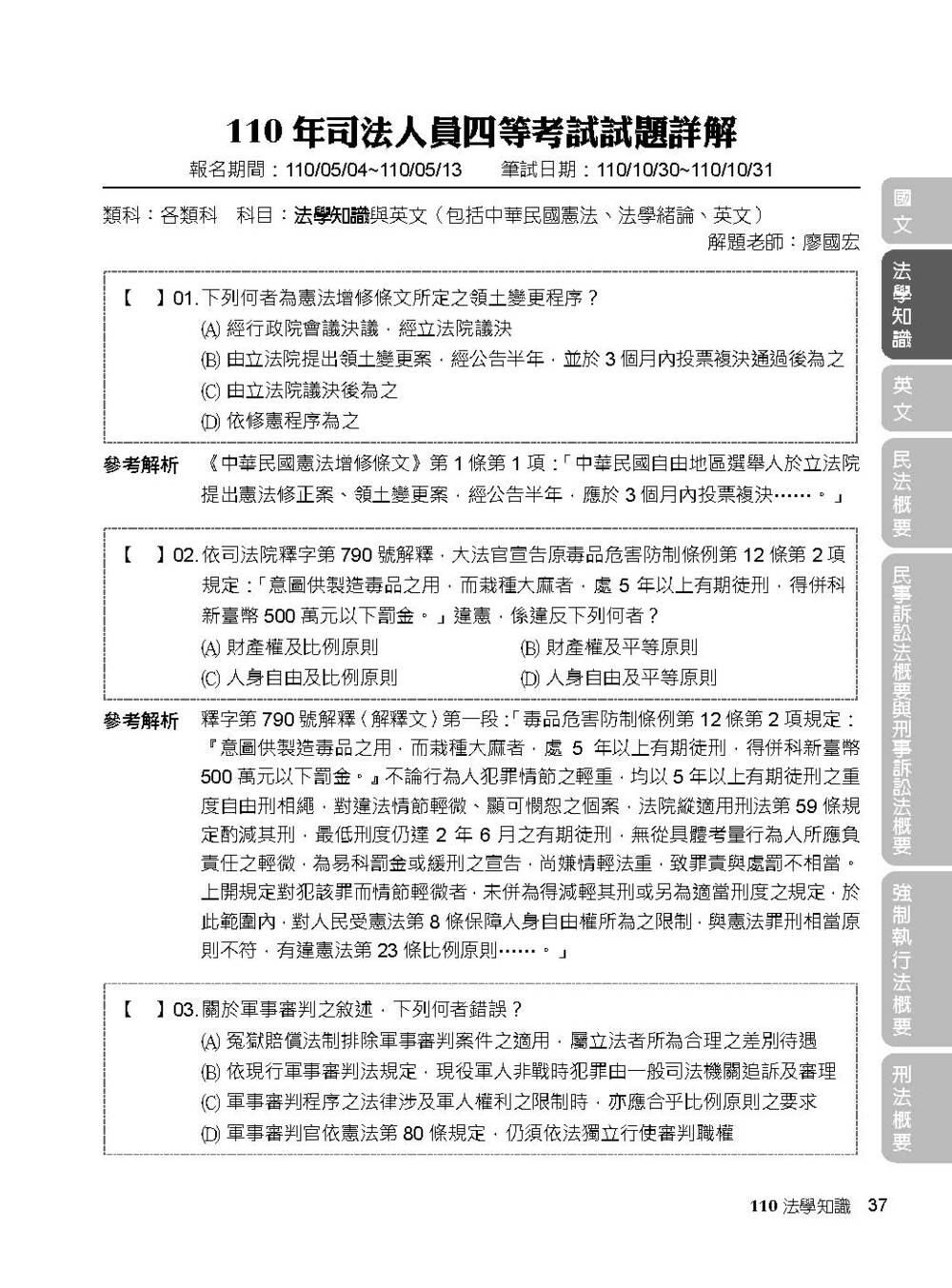 書籍內涵考試科目:國文、法學知識、英文、民法概要、民事訴訟法概要與刑事訴訟法概要、強制執行法概要、刑法概要