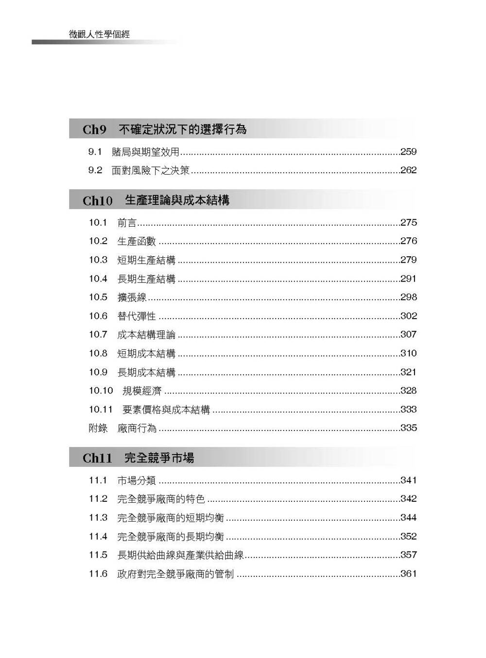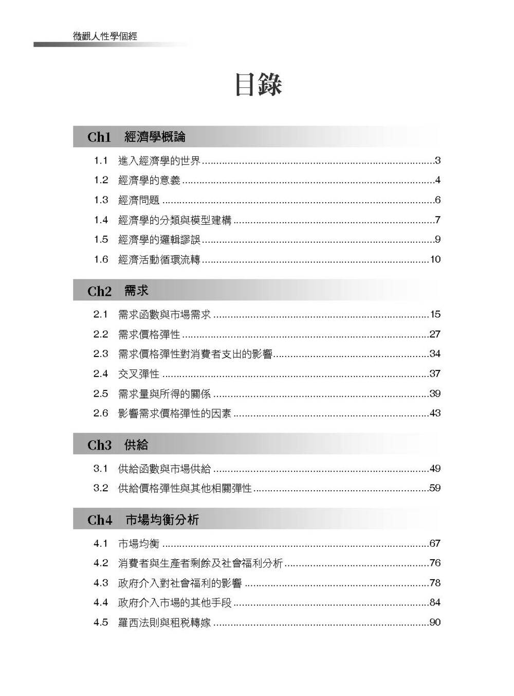 本書總共二十個章節,前四章主要針對基本的供需市場做討論。第五章開始一直到第九章著重在消費者行為模型的建構與應用。第十章到第十五章則將焦點著重在廠商身處不同市場的決策與行為。第十六章至第十八章除了討論同時考慮所有市場的一般均衡以外,也在模型中加入一些環保、污染或資訊不對稱的問題試圖更完美詮釋現實生活中的「不完美」。最後兩章則帶領讀者討論當國與國之間開放貿易的成因與開放後會出現的現象。