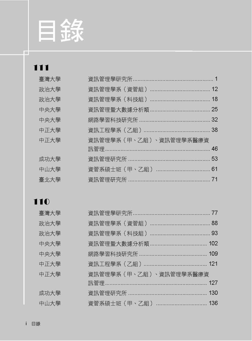本書收錄學校:台灣大學、政治大學、中央大學、中正大學、成功大學、中山大學、臺北大學、臺南大學
