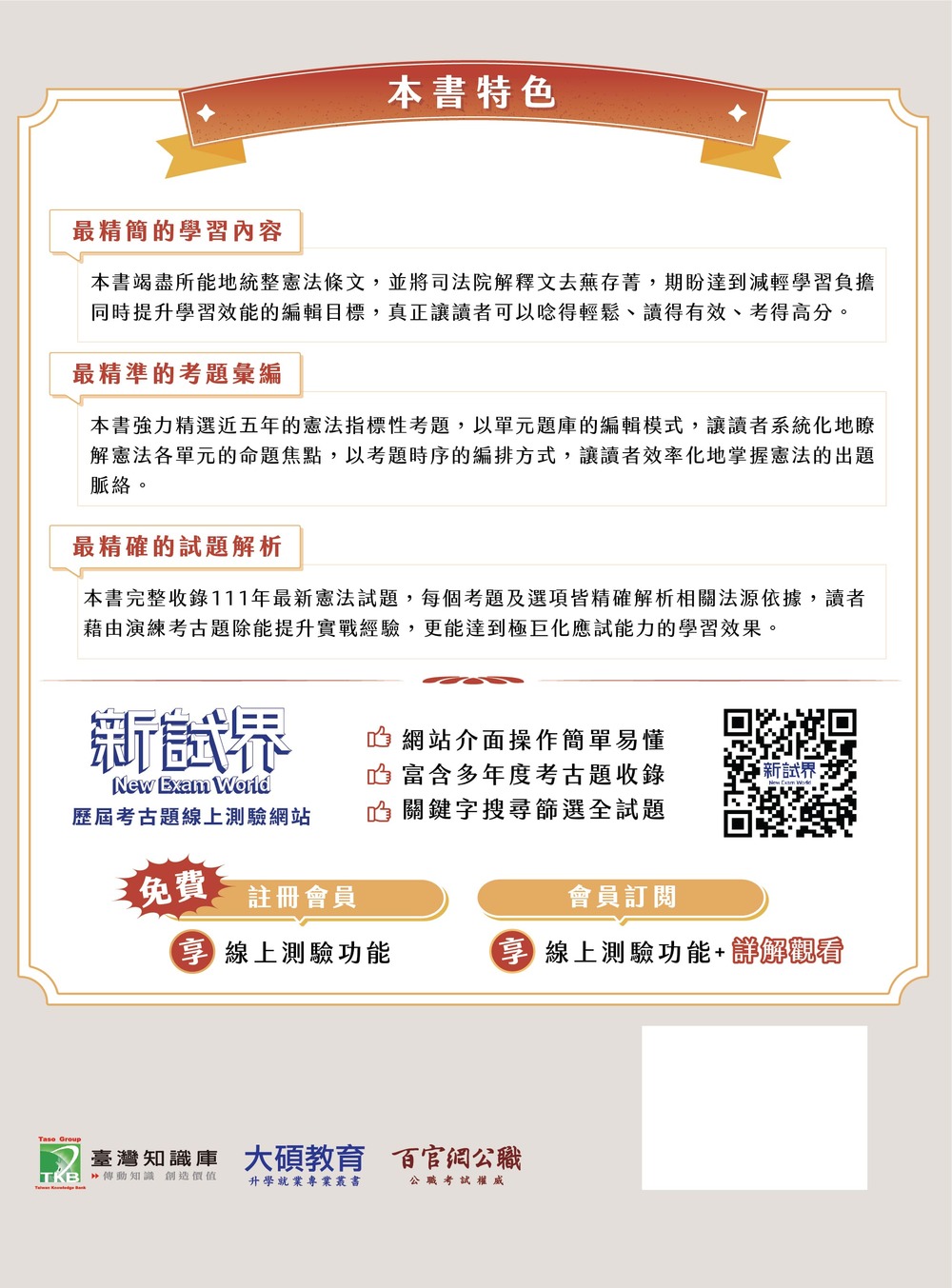 本書竭盡所能地統整憲法文,並將司法院解釋文去蕪存菁,期盼達到減輕學習負擔同时提升學習效能的編輯目標,真正讓讀者可以唸得輕鬆、讀得有效、考得高分。