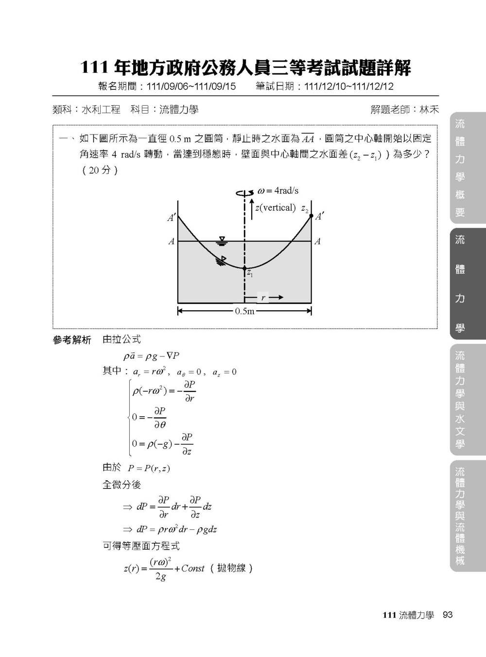 公職考試2023試題大補帖【流體力學】(107~111年試題)(申論題型)[適用三等、四等/高考、普考、地方特考、技師](CK2224)