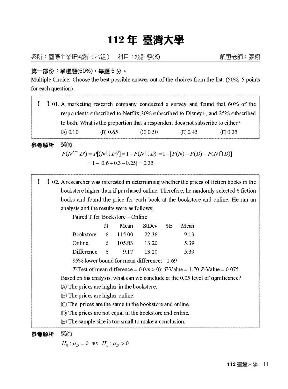 臺灣大學 國際企業研究所(乙組)、統計碩士學位學程