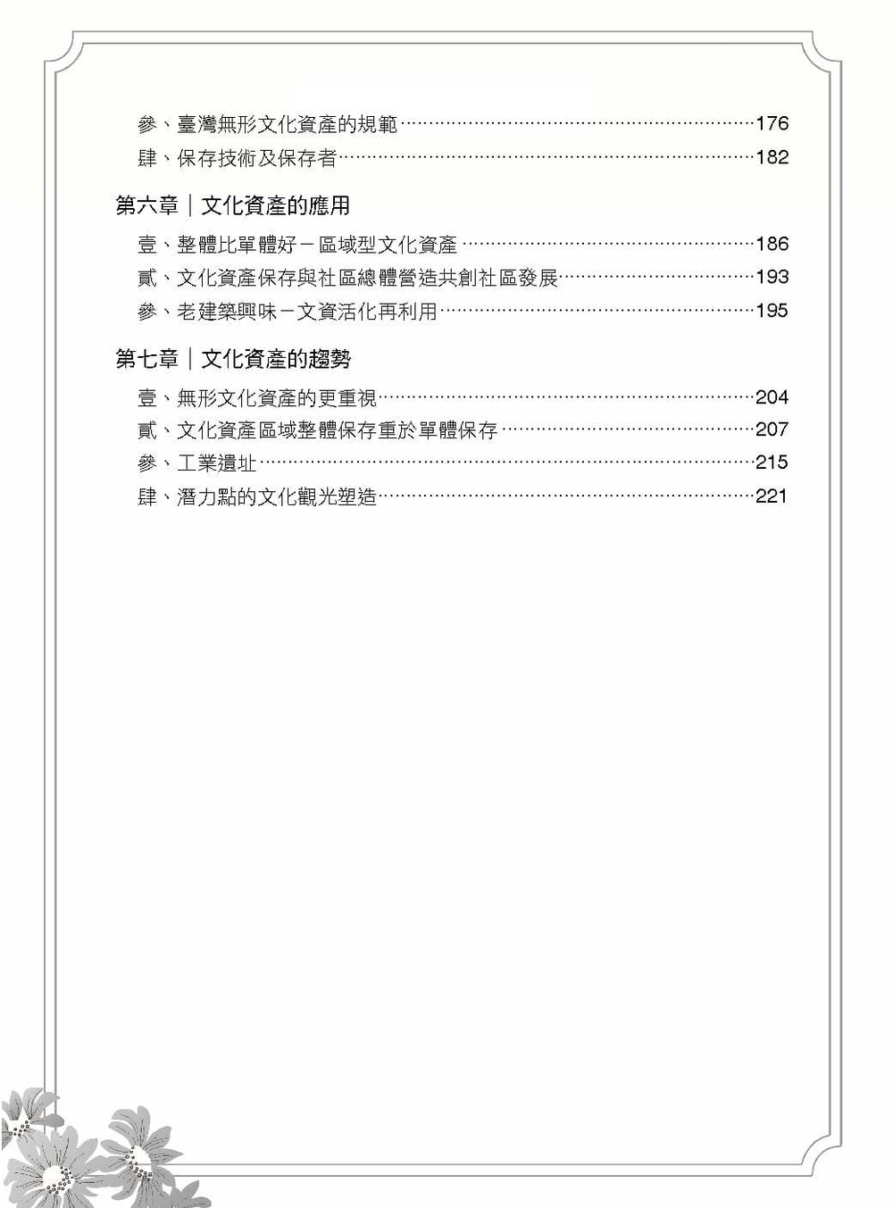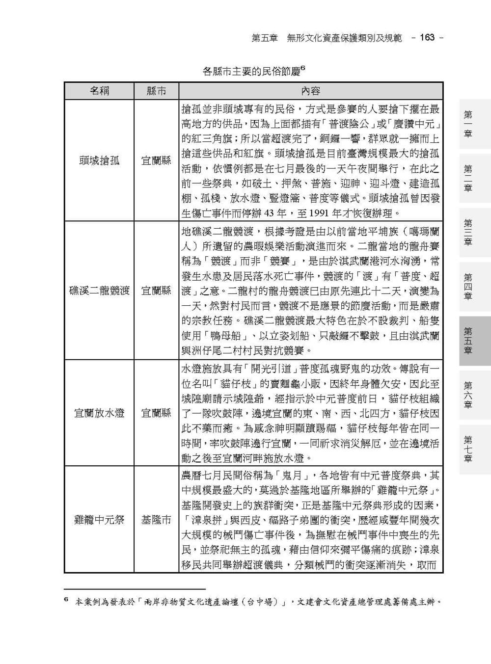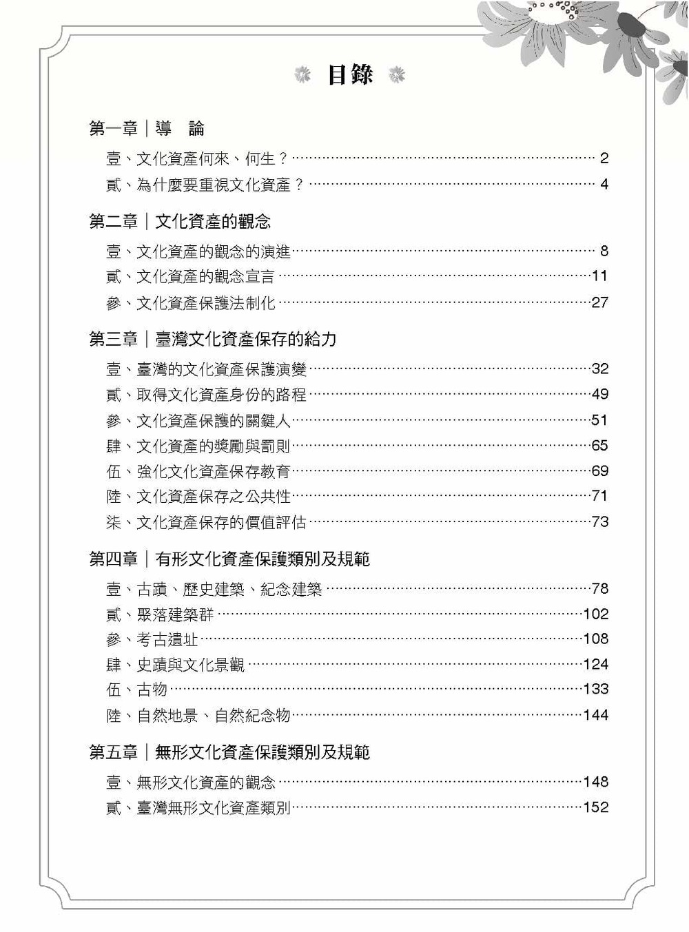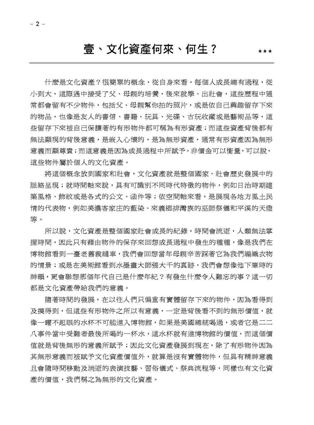 3. 分章介紹有形和無形文資,包括各項文資的指定及登錄(普查、審查、公告)、修復、管理維護及再利用、保存技術及保存者和廢止及案例。