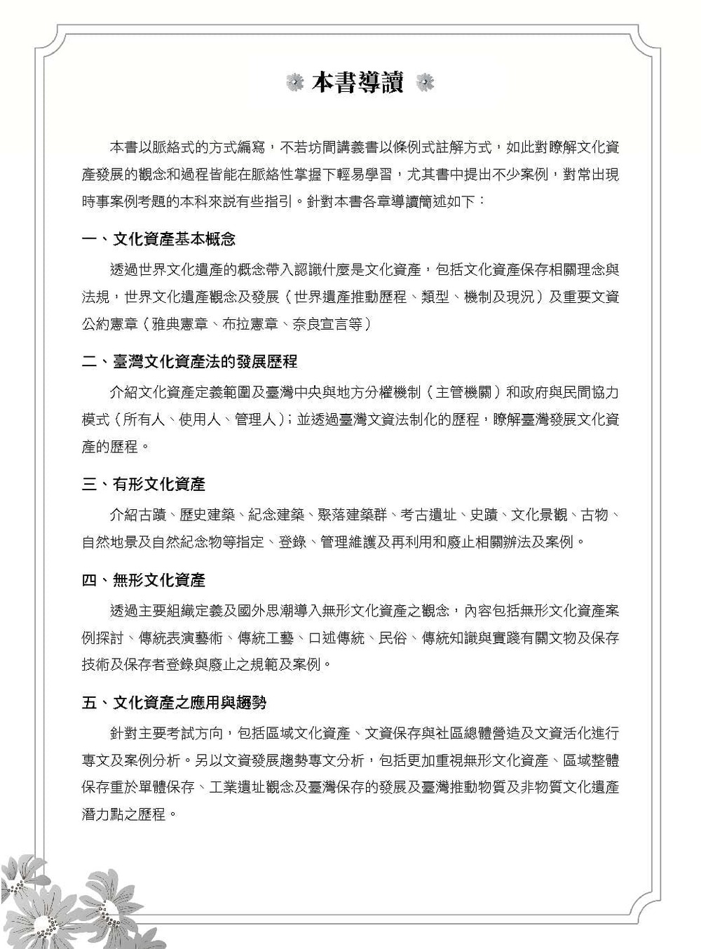 本書以脈絡式的方式編寫,不若坊間講義書以條例式註解方式,如此對瞭解文化資產發展的觀念和過程皆能在脈絡性掌握下輕易學習,尤其書中提出不少案例,對常出現時事案例考題的本科來說有些指引。針對本書各章導讀簡述如下: