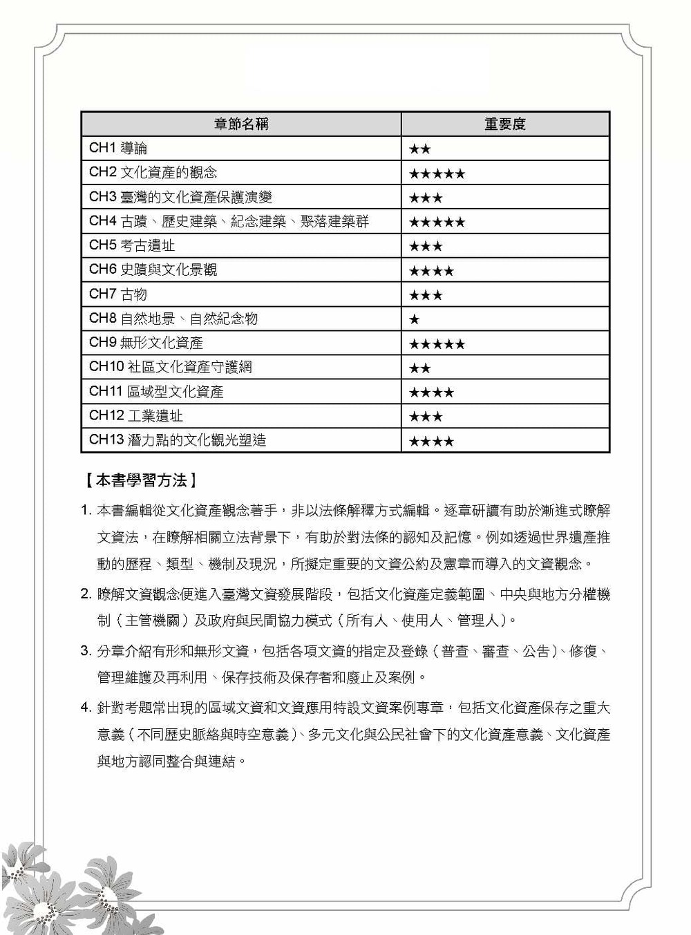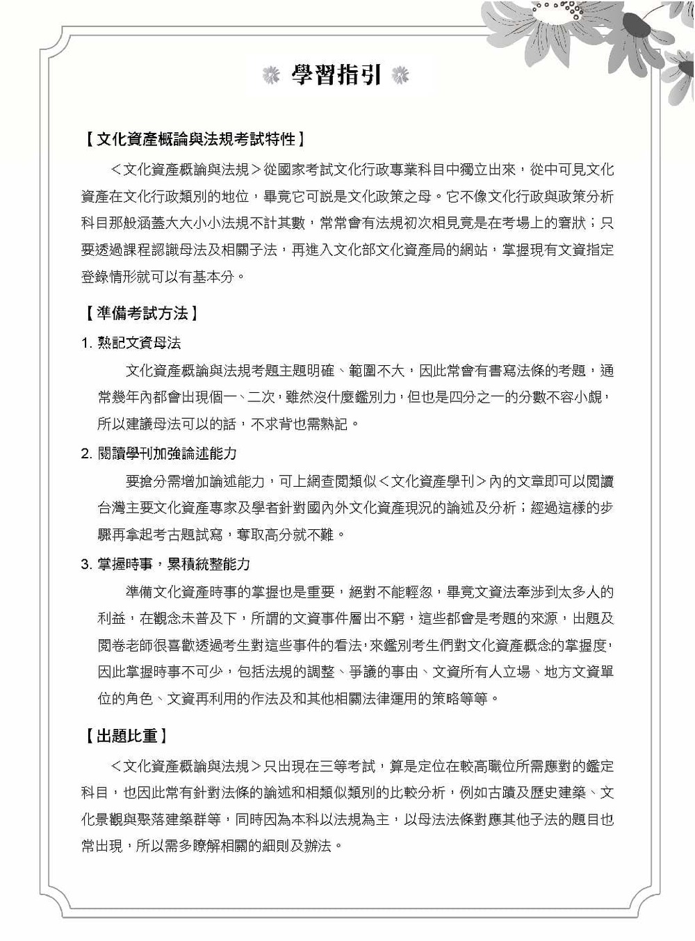 針對主要考試方向,包括區域文化資產、文資保存與社區總體營造及文資活化進行專文及案例分析。另以文資發展趨勢專文分析,包括更加重視無形文化資產、區域整體保存重於單體保存、工業遺址觀念及臺灣保存的發展及臺灣推動物質及非物質文化遺產潛力點之歷程。
