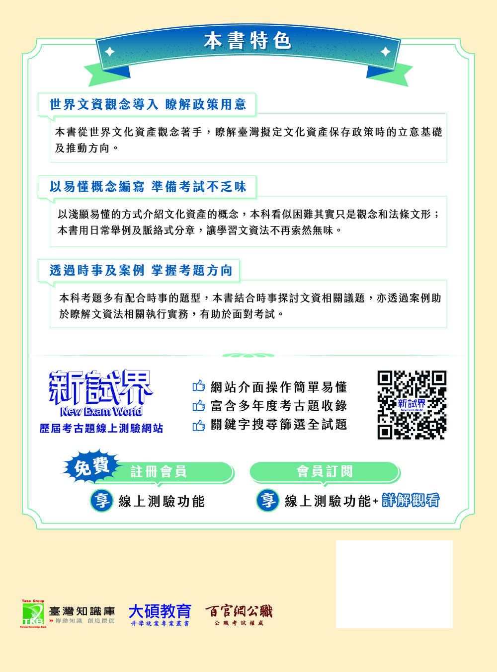 4. 針對考題常出現的區域文資和文資應用特設文資案例專章,包括文化資產保存之重大意義(不同歷史脈絡與時空意義)、多元文化與公民社會下的文化資產意義、文化資產與地方認同整合與連結。