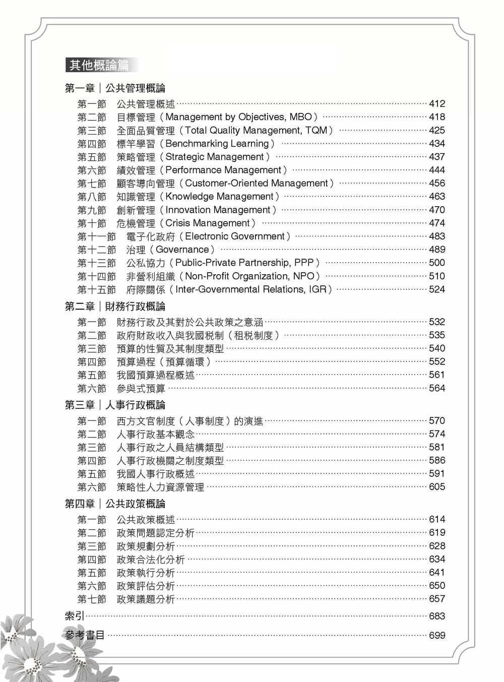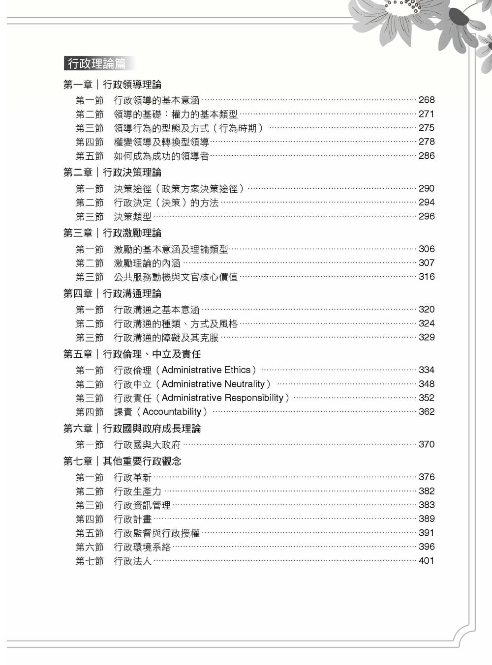 本書除了一般的「章節目錄」之外,亦收納了「國外學者」及「專有名詞」索引,此次改版更新增了「主題目錄」(如起源論、意涵論、特徵論、功能論等),堪稱目前國內行政類考用書中最完整的書籍檢索功能,有利於同學進行考古題的拆解與練習。