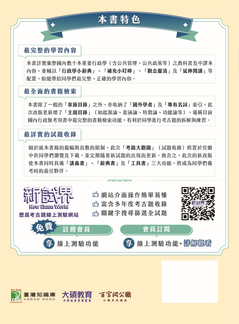 囿於紙本書籍的篇幅與頁數的限制,此次「考題大觀園」(試題收錄)將置於官網中供同學們瀏覽及下載,並定期隨著新試題的出現而更新。換言之,此次的新改版使本書同時具備「講義書」、「辭典書」及「工具書」三大功能,將成為同學們備考時的最佳夥伴。