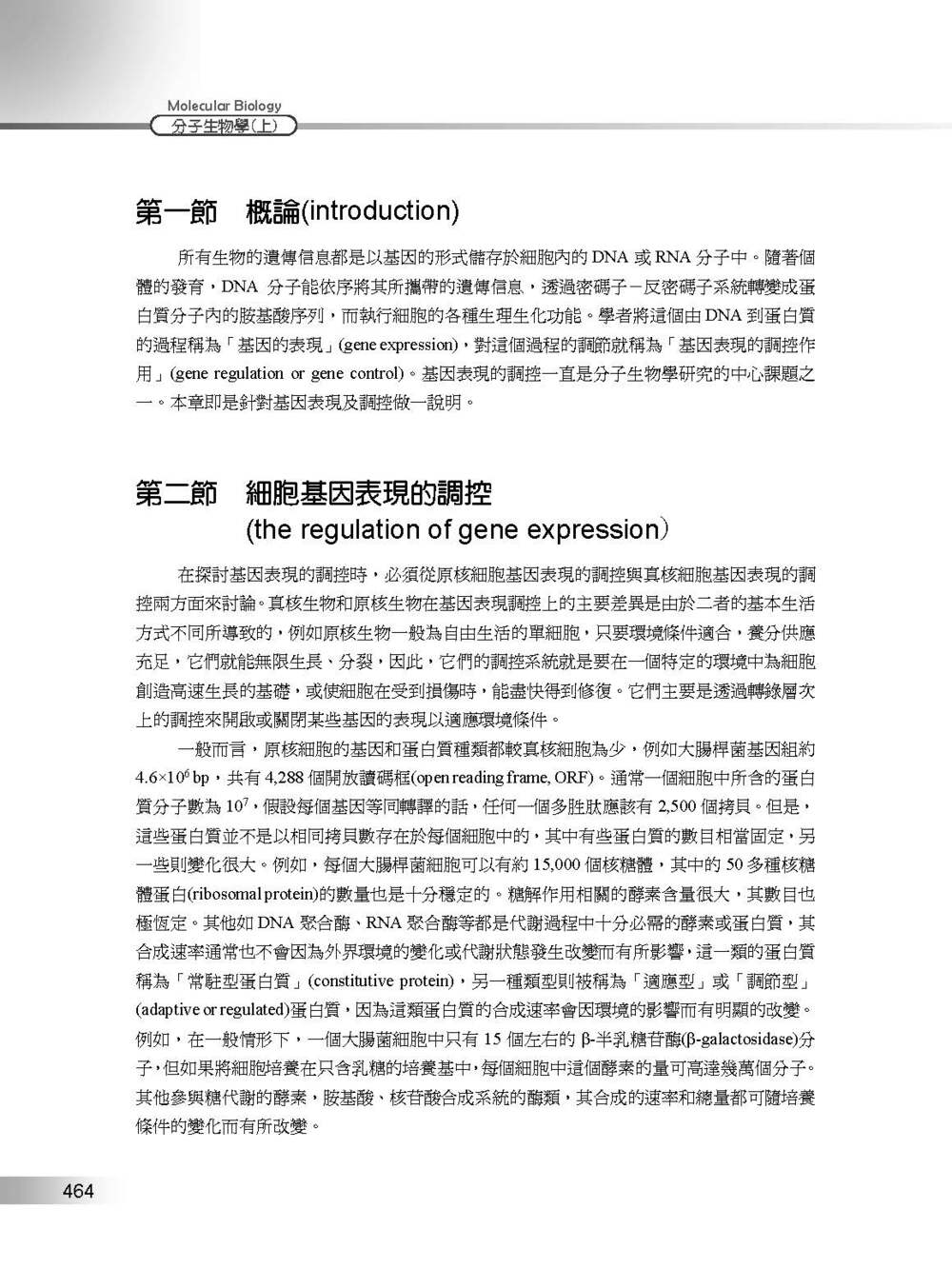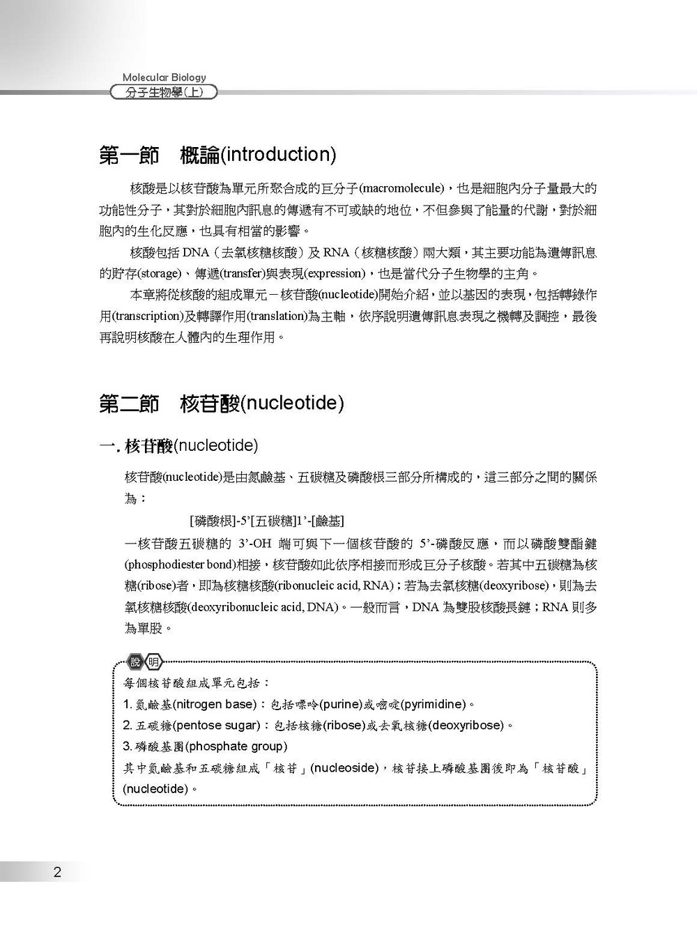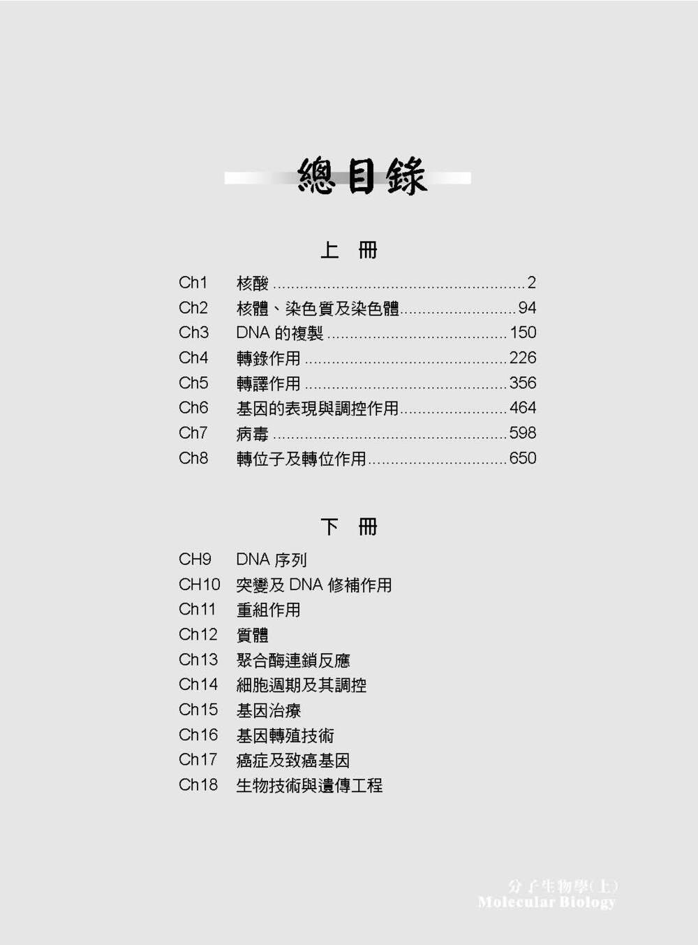 本書共分十八章,其中上冊部分共八章,下冊共十章,第一章介紹分子生物的基礎-核酸(nucleic acid),對於核酸的基本結構及組成,做一詳盡的介紹。第二章則介紹核小體(nucleosome)及染色體(chromosome),對於遺傳物質的高層次結構加以說明。接下來幾章則分別以分子生物學的「中心信條」(central dogma)為骨架,針對DNA 的複製、轉錄作用(transcription)、轉譯作用(translation)以及基因表現的調控做最詳盡的說明,相信讀者在讀完本書上冊後,必能對分子生物學有另一番不同的認識。