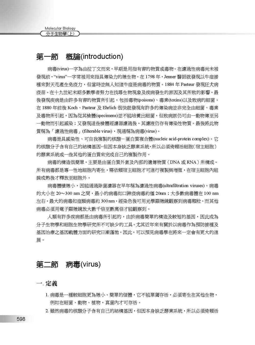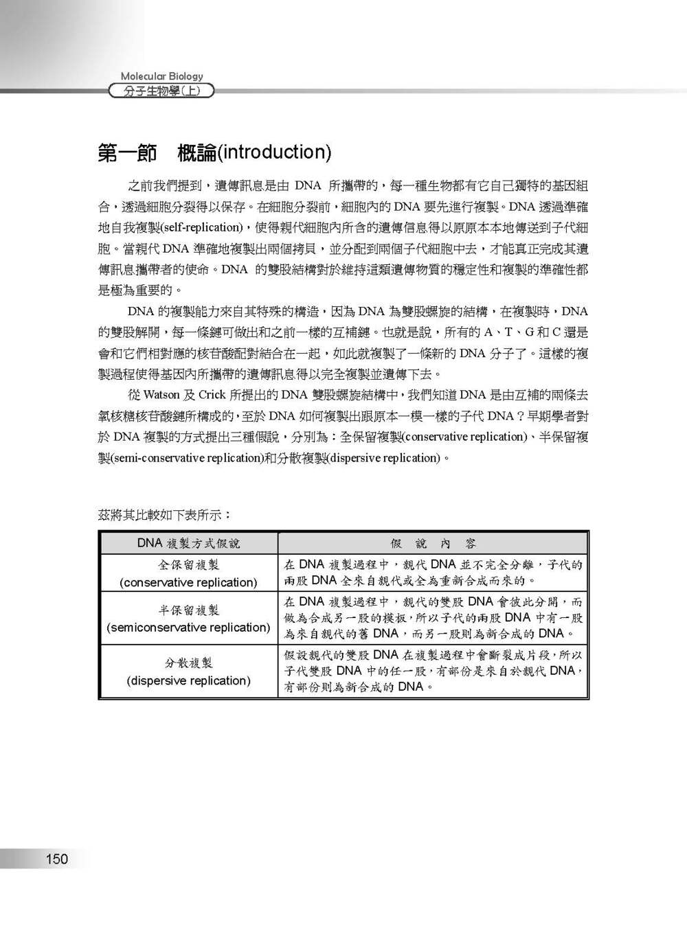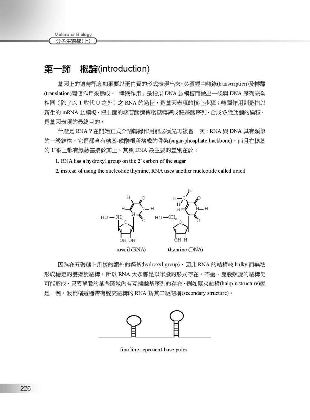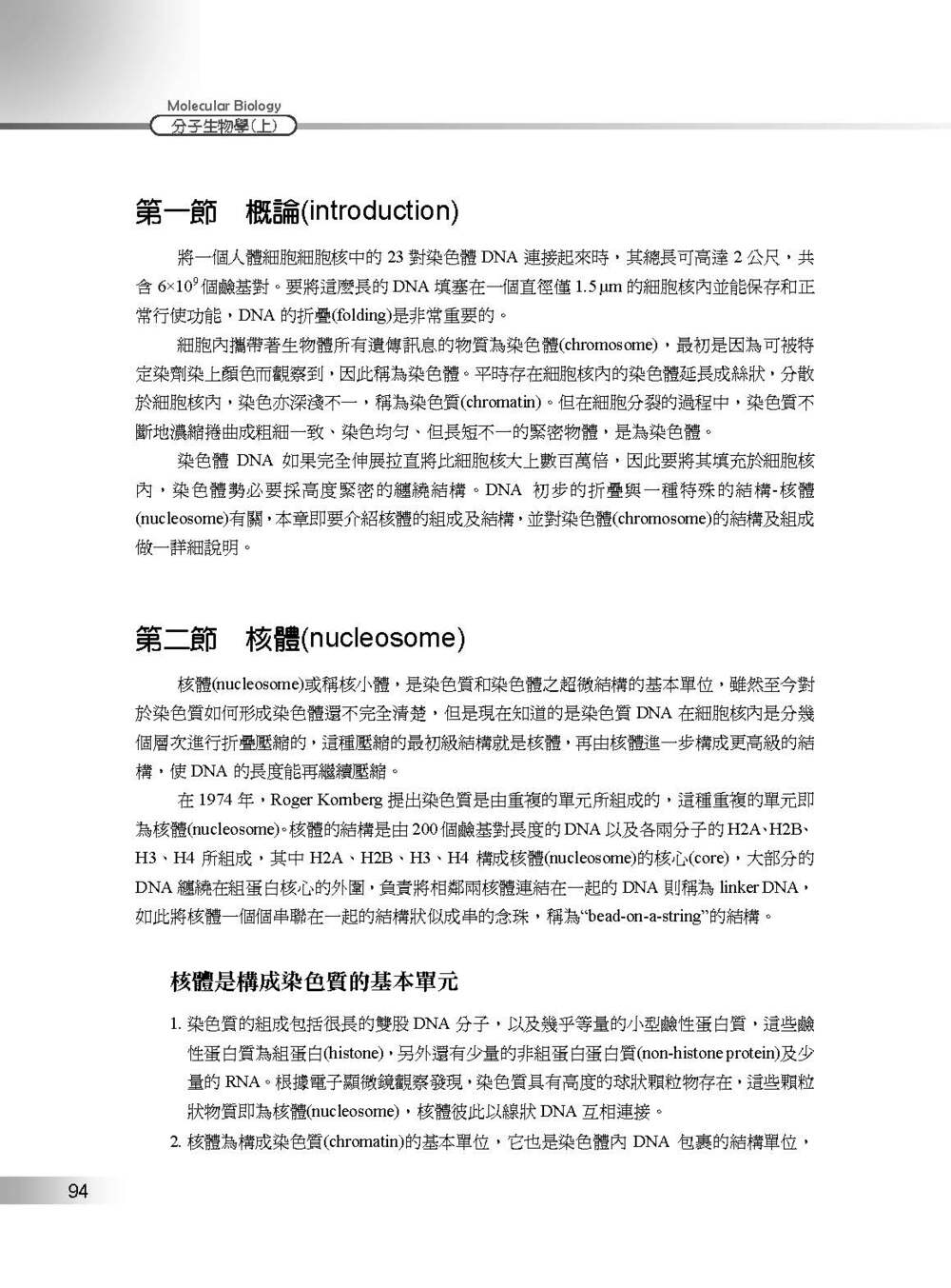 本書共分十八章,其中上冊部分共八章,下冊共十章,第一章介紹分子生物的基礎-核酸(nucleic acid),對於核酸的基本結構及組成,做一詳盡的介紹。第二章則介紹核小體(nucleosome)及染色體(chromosome),對於遺傳物質的高層次結構加以說明。接下來幾章則分別以分子生物學的「中心信條」(central dogma)為骨架,針對DNA 的複製、轉錄作用(transcription)、轉譯作用(translation)以及基因表現的調控做最詳盡的說明,相信讀者在讀完本書上冊後,必能對分子生物學有另一番不同的認識。