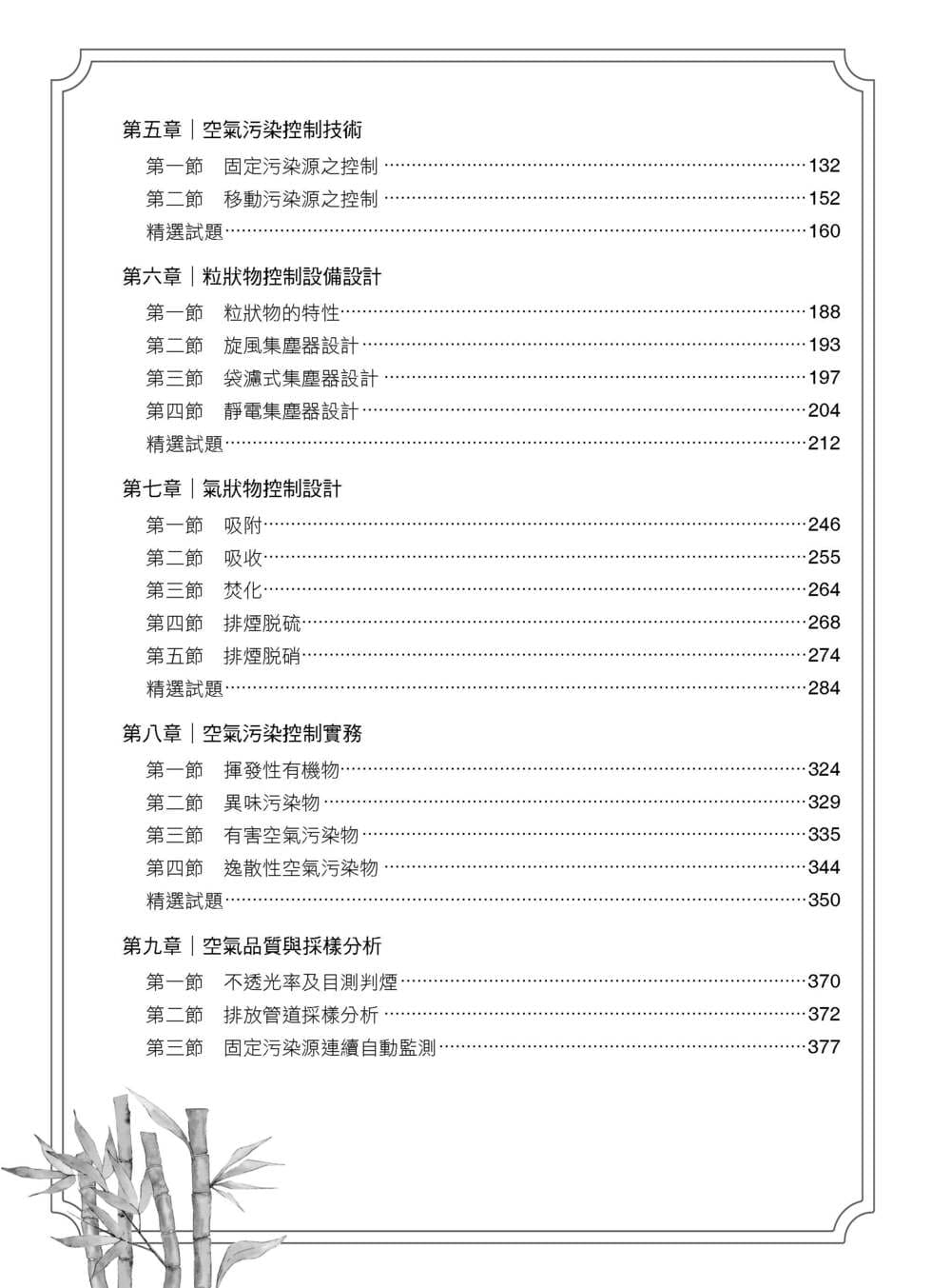 本書內容於「空氣污染控制」部分共分為11章,第1~4章為基礎篇章,旨在建立讀者對於空氣污染之成因、種類及影響等基本認知;第5~8章為應用技術篇章,旨在瞭解及學習各種空氣污染控制技術之原理及設計應用;第9~11章為行政管制篇章,旨在瞭解空氣污染物採樣檢測之重點及代表性,以及溫室效應、室內外空氣污染等大氣環境議題之相關政策方向與立法管制重點。