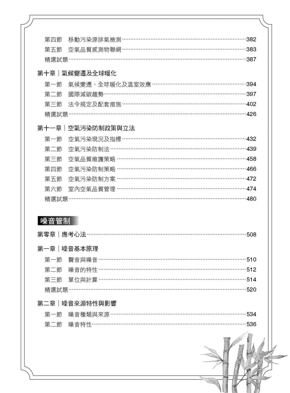 本書編著內容及範圍,適用於準備環境類科之相關國家考試,包括高考、普考、特考、技師考,同時也適用於經濟部所屬國營事業機構(台電、中油、台水、台糖)新進人員聯合招考之環工類別考試。由於前述國家考試中「空氣污染控制」及「噪音管制」兩項科目係合併為一個應考科目,且歷年該兩項科目之出題佔分比重均約為70~80%:20~30%,故本書內容亦依據其各別出題佔分比例分配著作篇幅,並於每章最後隨附對應之代表性歷屆考題及完整解答,以利讀者掌握應考方向及快速練習答題方式與技巧,縮短複習所需時間並且建立日後應考信心。