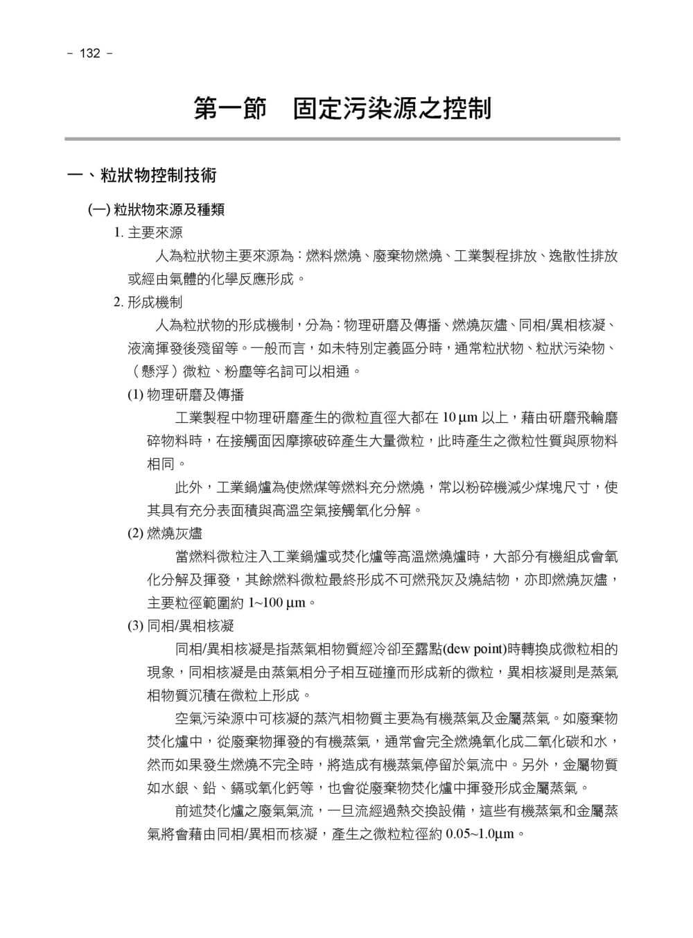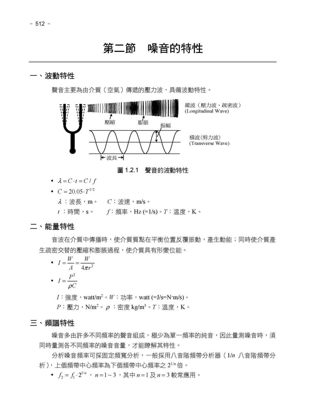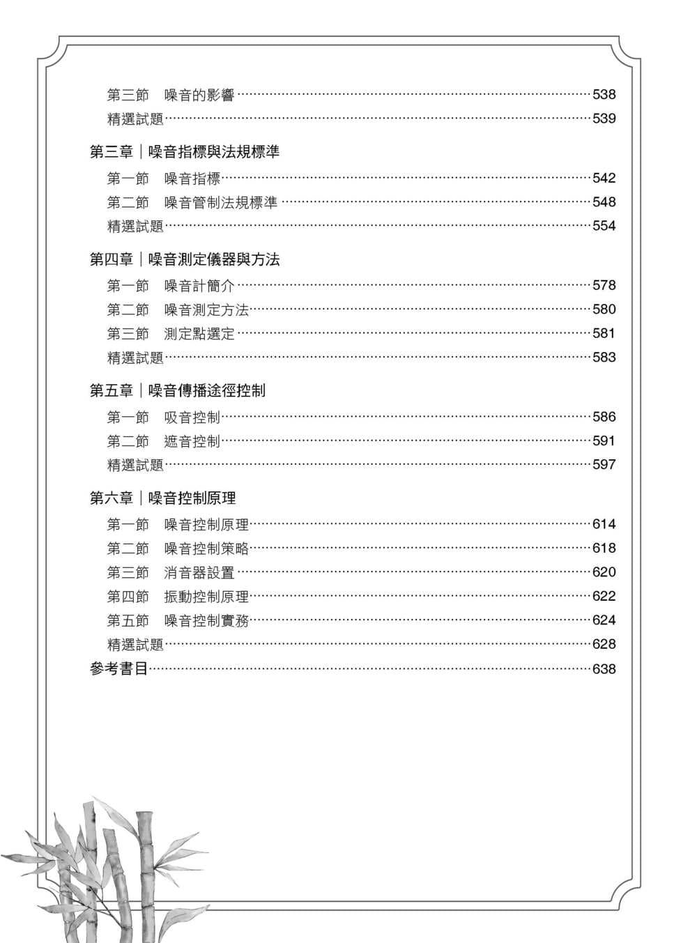 「噪音管制」部分共分為6章,第1~2章為基礎篇章,旨在建立讀者對於噪音之成因、定義及來源與對人體影響等基本認知;第3~4章為行政管制篇章,旨在瞭解各類噪音採樣檢測之方式及代表性,以及噪音管制相關法規標準內容重點;第5~6章為應用技術篇章,旨在瞭解及學習各種噪音問題改善原理及控制技術。
