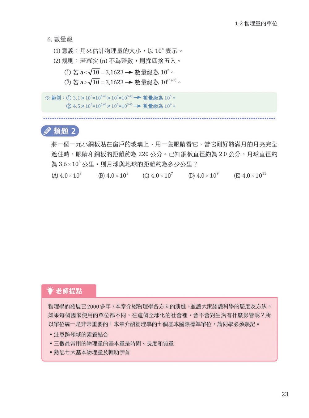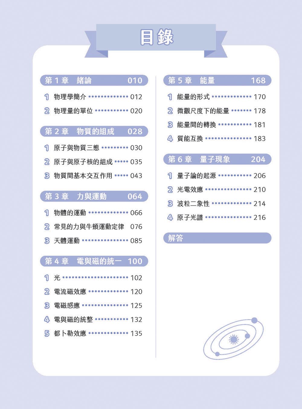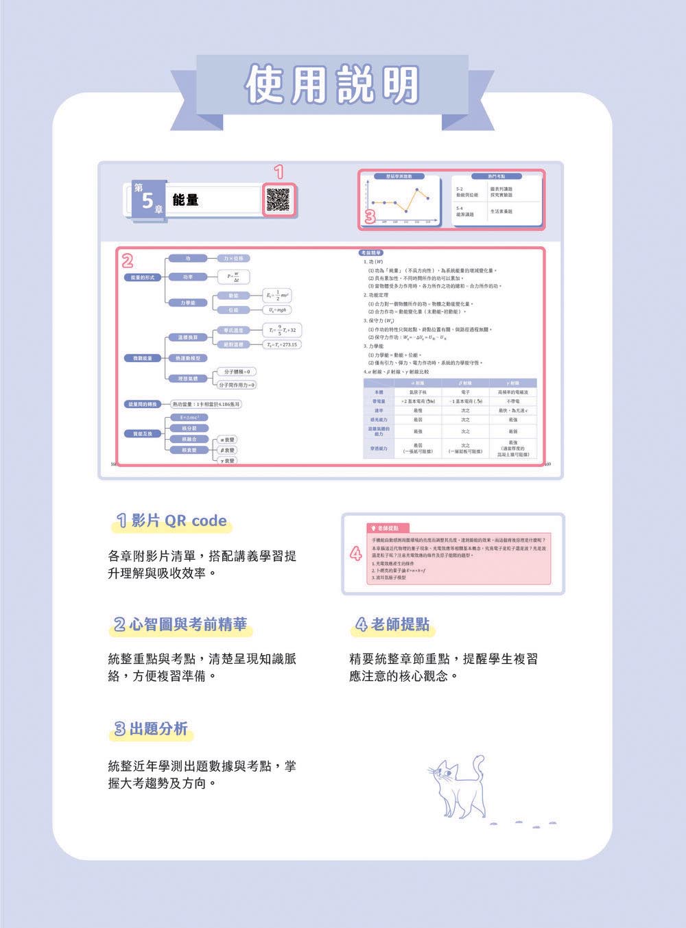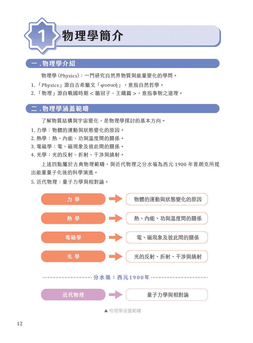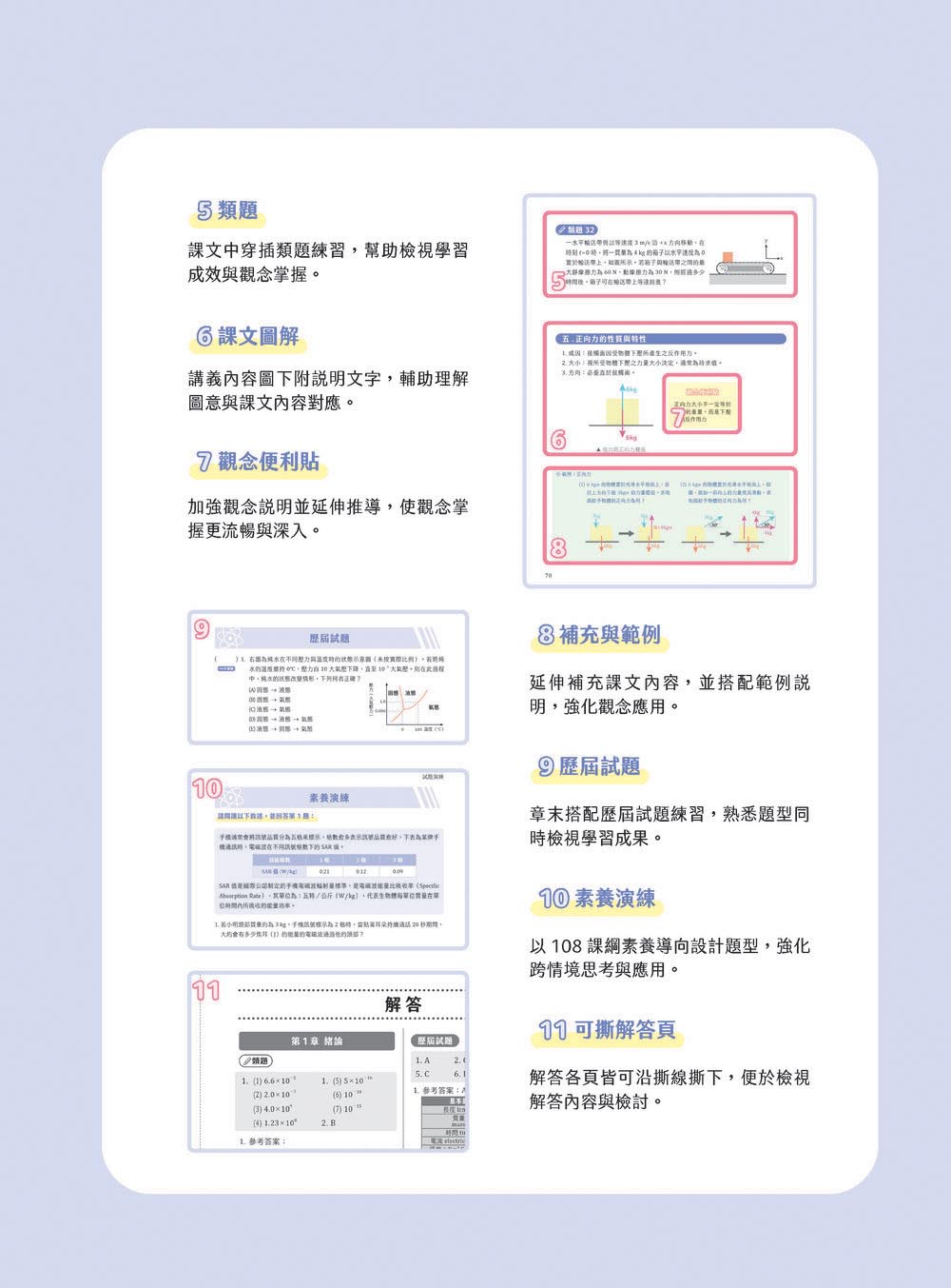 依據高一物理所學單元進行排序,依序介紹各單元知識點,以簡潔精練的文字使學生更好地掌握重點,並配合相關補充與範例,搭配類題練習,幫助學生鞏固概念、提升應用力。部分內容另設有「觀念便利貼」,讓知識脈絡更加清晰。