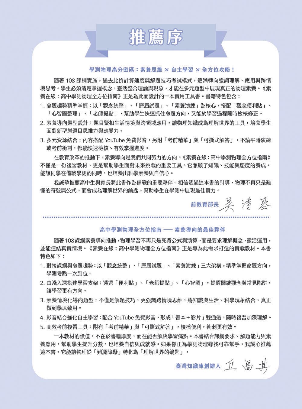 本書針對高中學測物理範圍,全面統整必備的核心知識點,協助學生在複雜的課綱內容中建立清晰的學習脈絡。各章節精選與重點概念相呼應的歷屆學測試題,讓學生在實際演練中熟悉大考題型,逐步掌握解題策略。同時,為因應素養導向命題趨勢,書中特別收錄教師親自編寫的素養題,題目設計兼具真實情境與跨概念整合,強化學生的理解力與應用力。