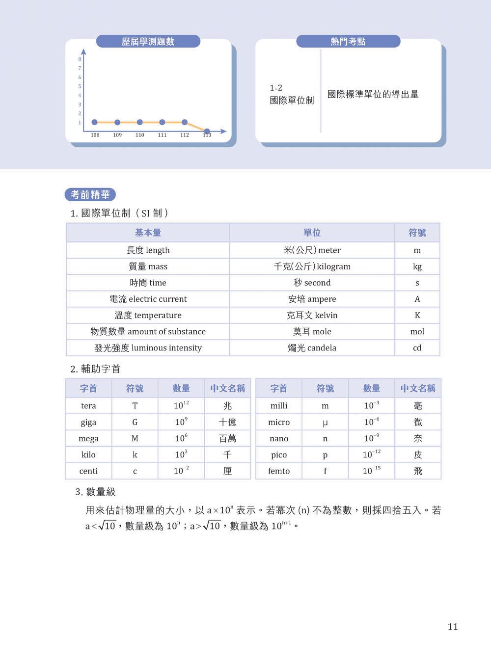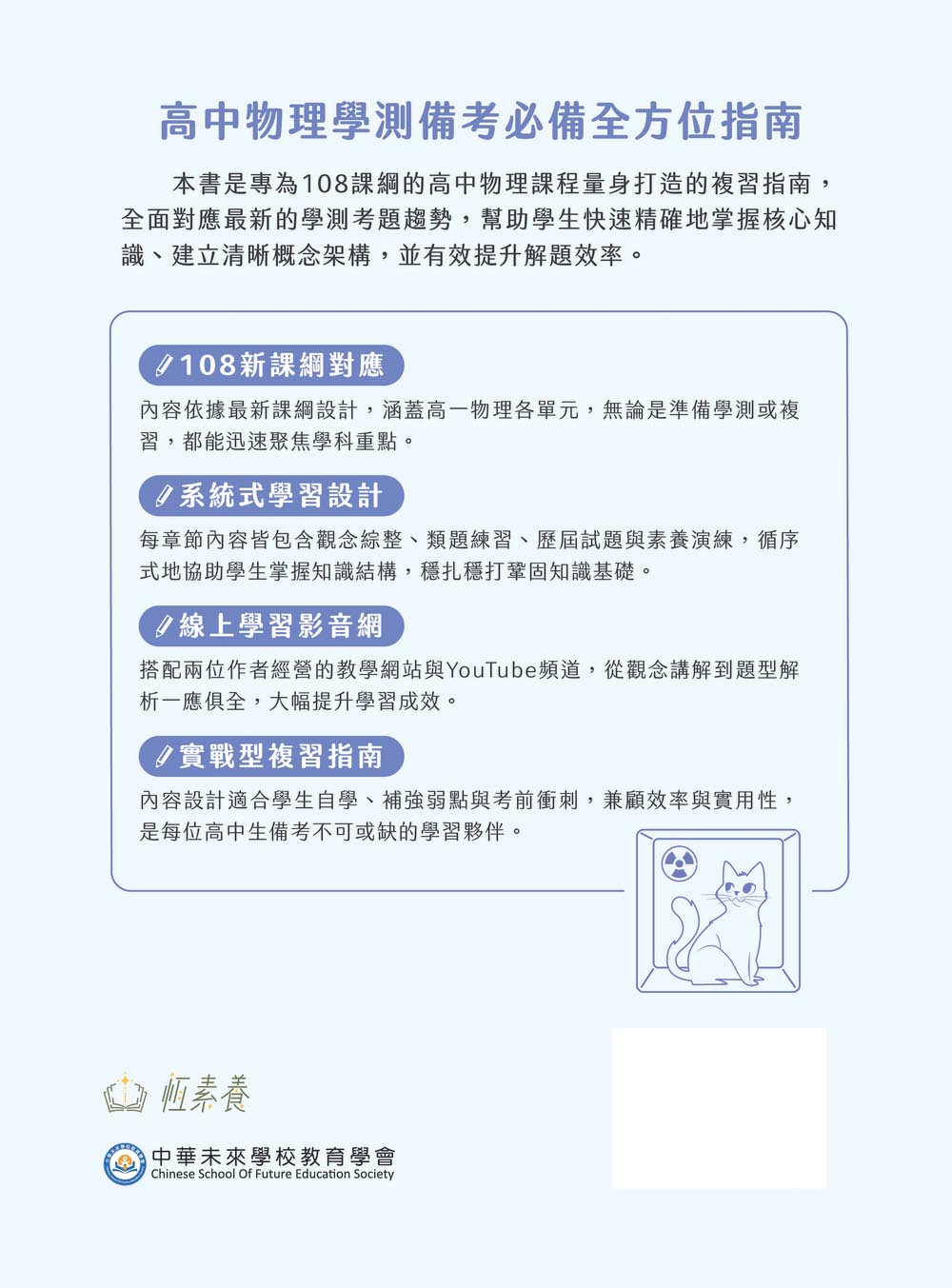 本書內容完整彙整 108 課綱下高中物理科的學習重點,幫助學生迅速掌握各單元的核心知識與觀念結構,並精準對應學測常見的關鍵考點。無論是準備學測,還是進行高一物理複習,都能藉由本書建立清晰的知識架構,達到系統化、高效率的學習效果。本書內容設計兼容各大高中版本課本,無論學生使用哪一出版社的教材,都能輕鬆對照使用。特別適合希望自學、補強弱點或進行考前衝刺的高中生,讓複習不再盲目,準備物理考試事半功倍。