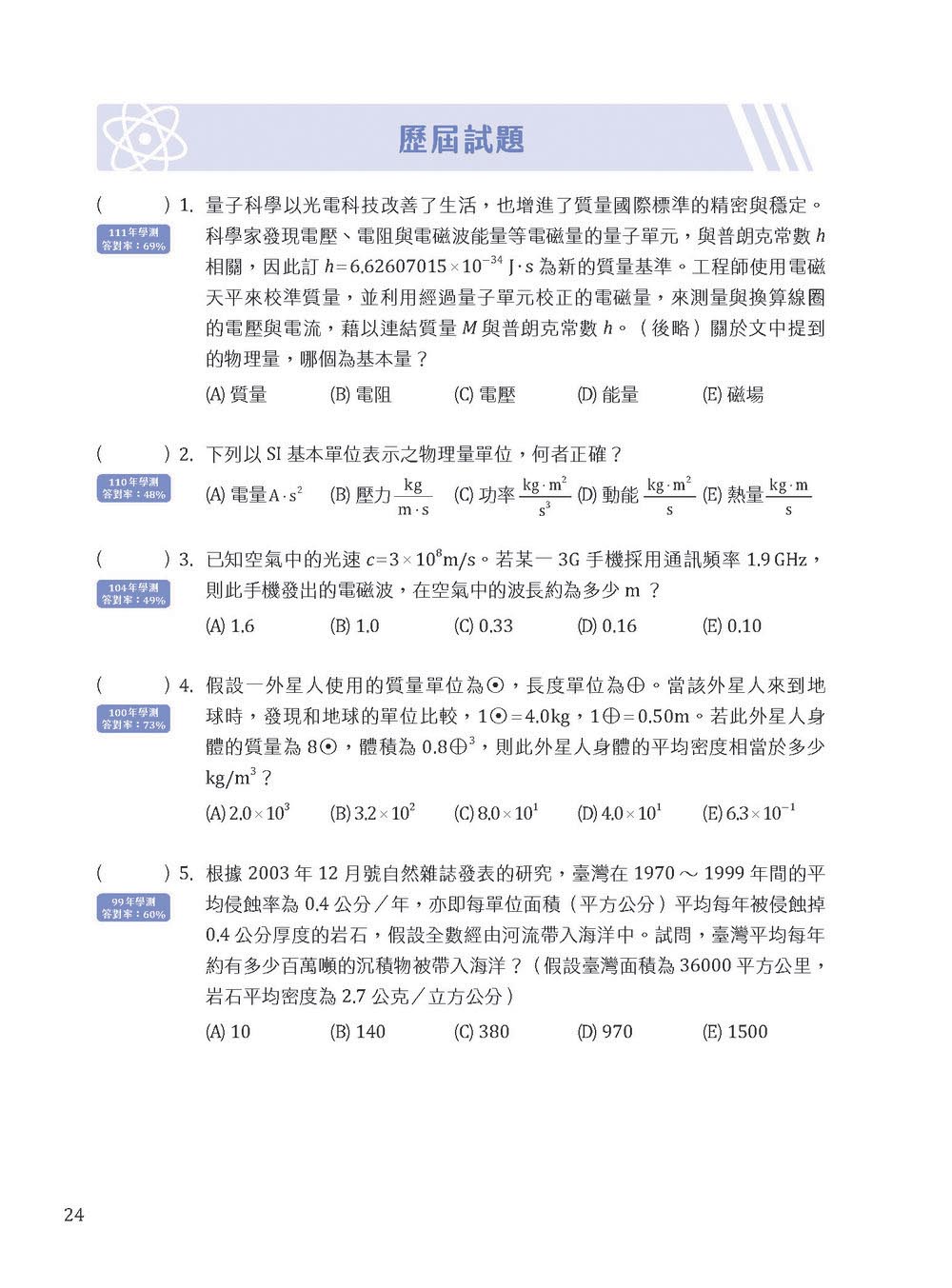 本書精選涵蓋各單元的歷屆學測與指考試題,題目設計兼具代表性與多樣性,方便學生自我檢測學習成果與掌握重點。於題目下方附有全國考生的答對率,幫助學生了解試題的難易程度,進而調整複習方向,達到更有效率的練習與實戰準備。