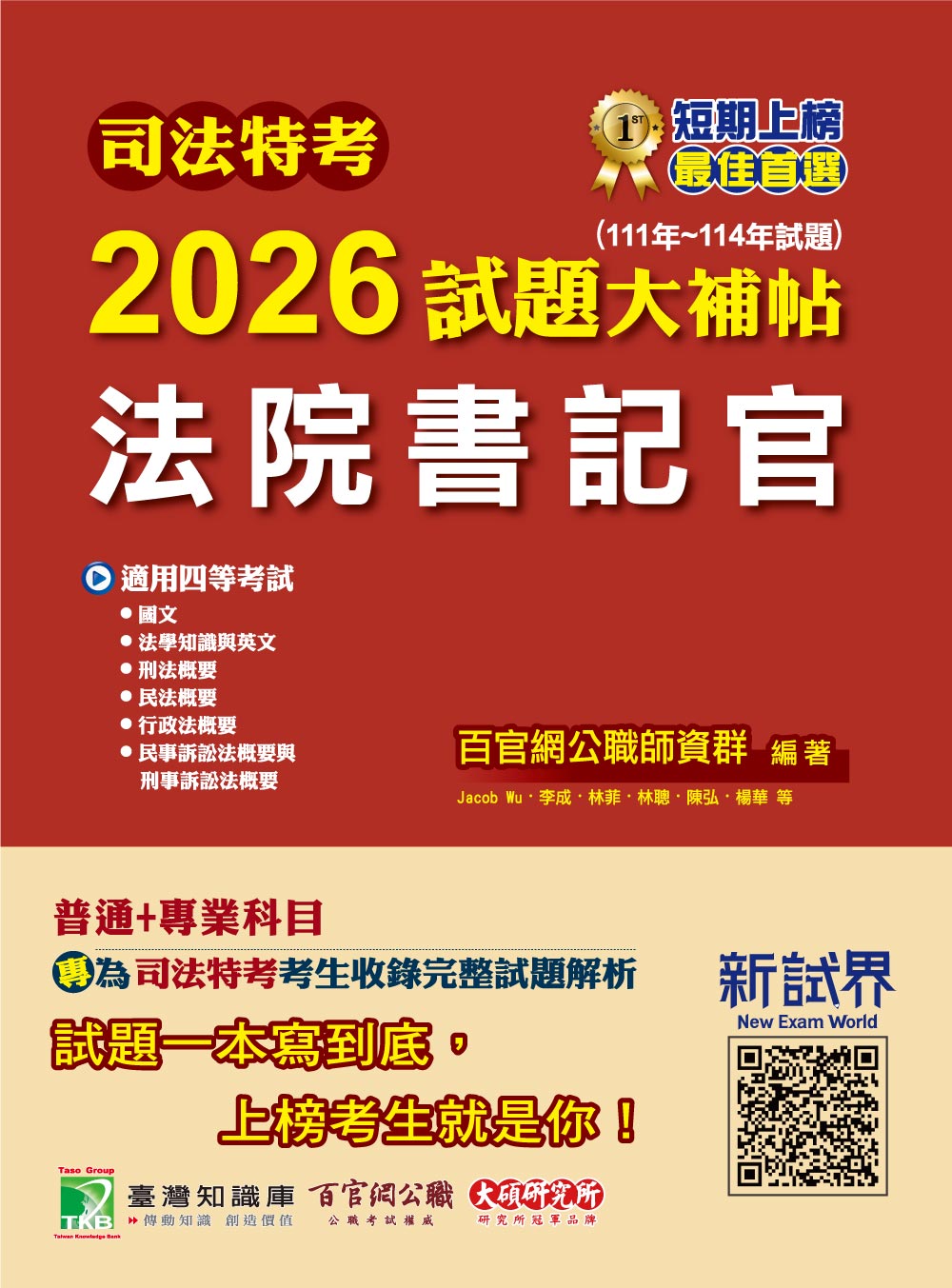 司法特考2026試題大補帖【法院書記官】普通+專業(111~114年試題)[適用四等/含國文+英文+法學知識+行政法概要+民法概要+民事訴訟法概要與刑事訴訟法概要+刑法概要](CK4351)