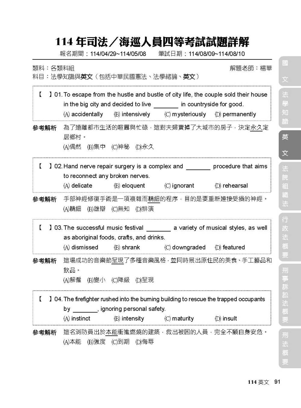 3. 右頁附頁籤以標示該份試題的科目,方便書籍使用者快速查找想要練習的科目。
