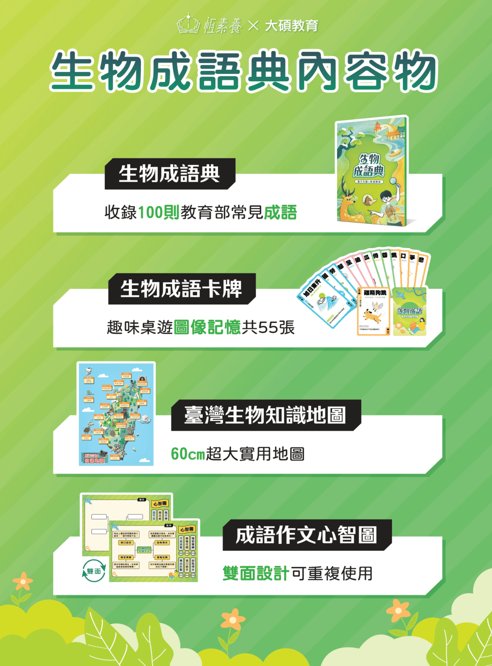 大碩教育素養文創系列,致力於開發素養教育學習教材,繼〈黑白貓中醫繪本〉後再度推出跨域遊戲學習套組〈生物成語典──親子共讀×跨域學習〉呼應核心素養之「自發、互動、共好」精神,利用活潑的學習遊戲與親子互動,讓素養教育融入生活,培養每一位孩子成為終身學習者。