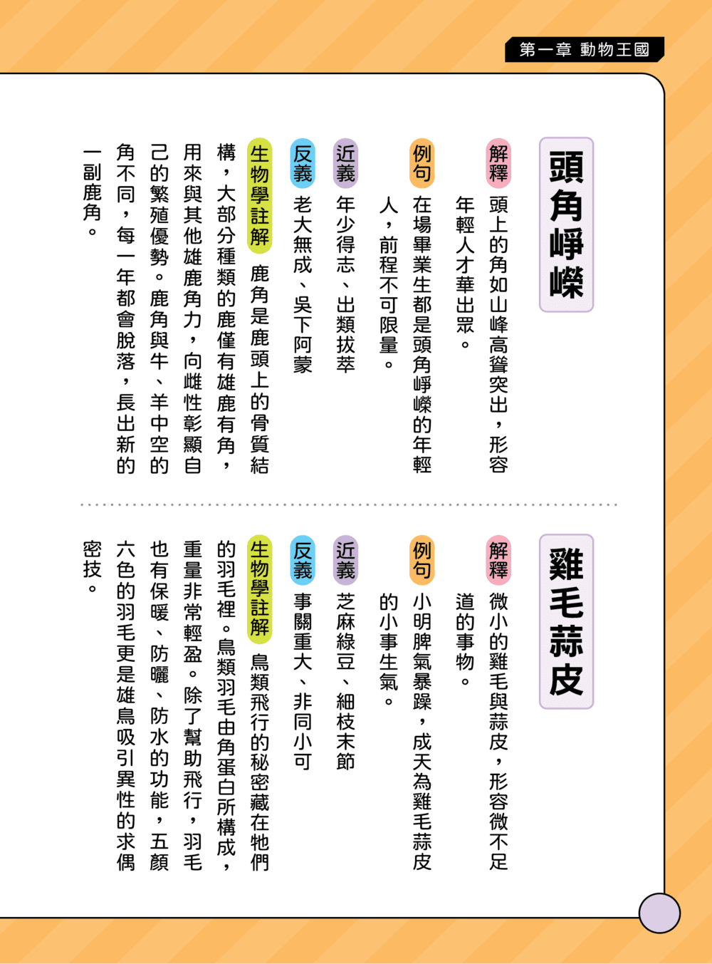 一.100則成語 × 100則生物知識--全書分為動物、植物、人體、生態永續四大領域,包含成語及其註釋、近/反義詞、例句及生物學註解。
