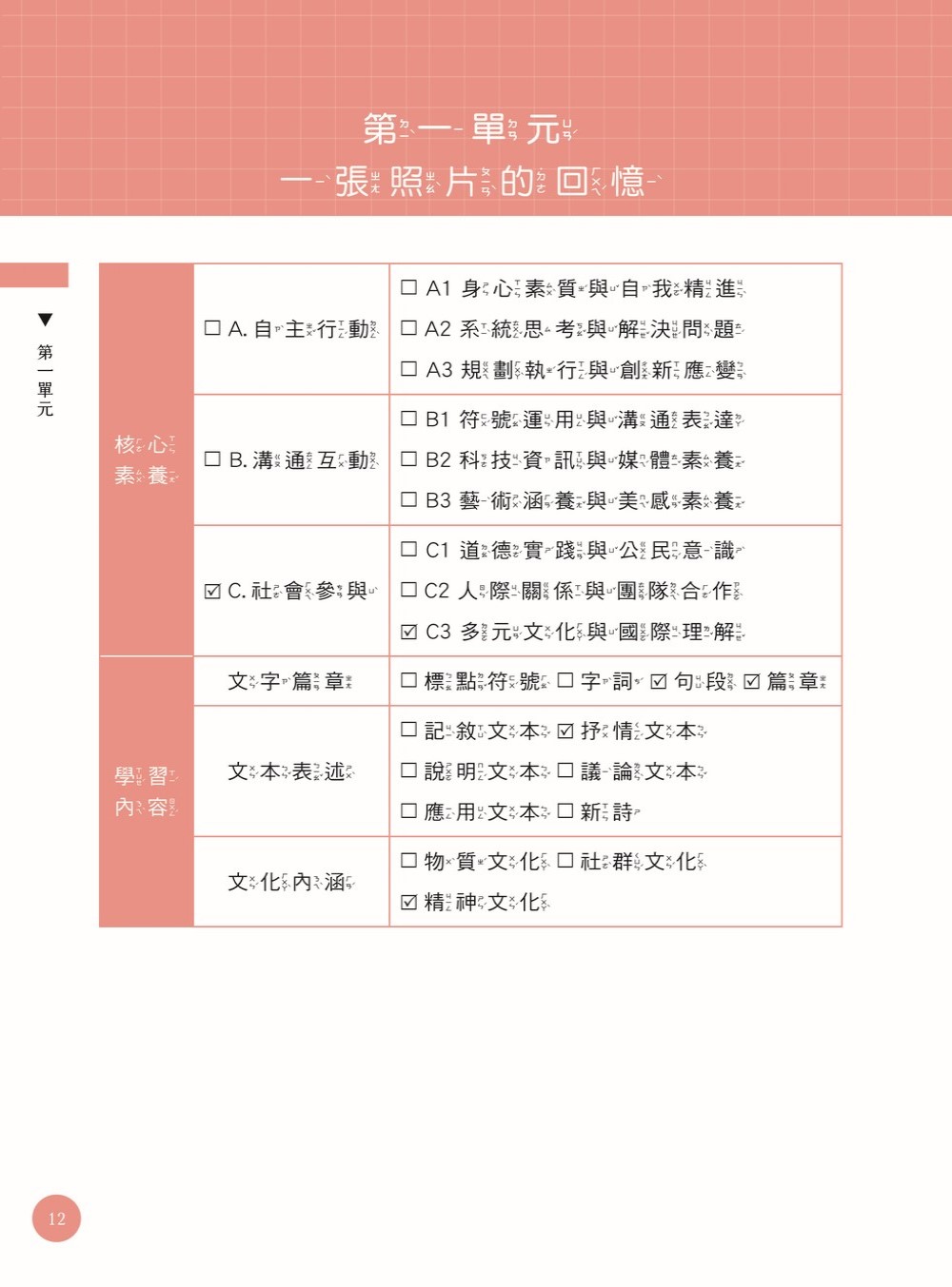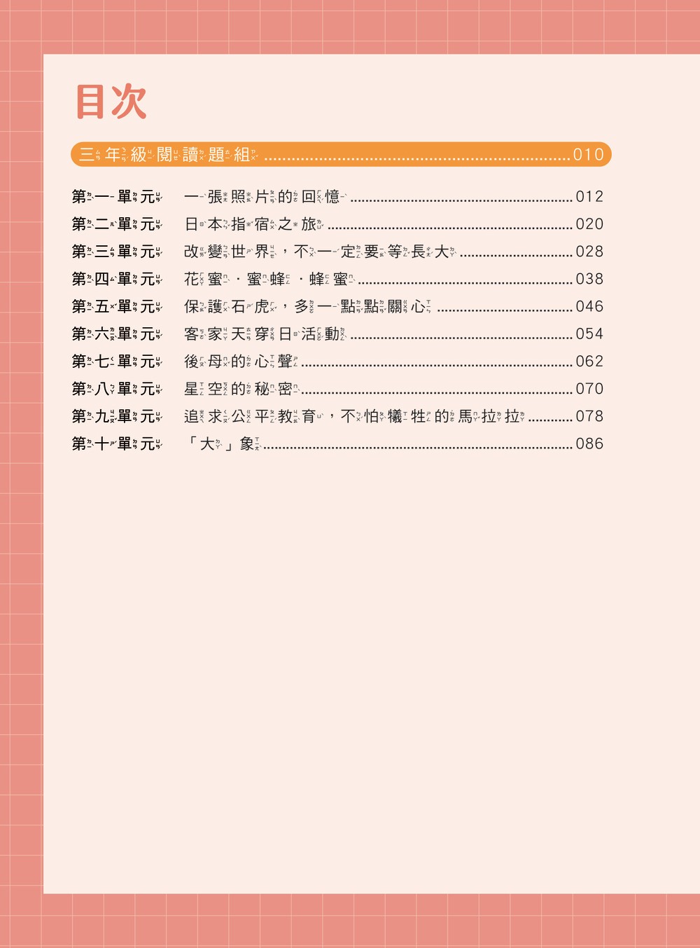 本書《素養檢定:國小國文素養題本 閱讀素養(中年級)》在文本挑選上,依108課綱三面九項核心素養,精挑細選與中年級特性相符的文本。另一項特色為文本後的自我評估表,能幫助學生即時測評自身學習狀況,進而找出自己的閱讀盲點。