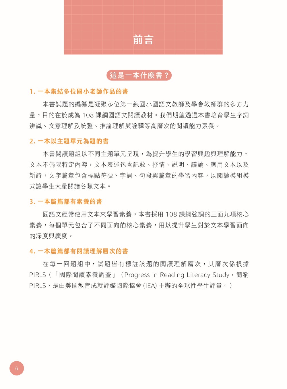 因應新課綱方向,本書結合第一線國小教師與學會教師群力量,設計出一篇篇有趣且有深度的文章,讓學生能夠感受到文字的魅力,並培育國小生的基礎語文能力,逐漸適應長文閱讀,加強文學、文化、評析、審美與感知的素養。題目後面也附上閱讀自我檢測,在檢測的過程中掌握學習情形,為未來的素養做好準備。