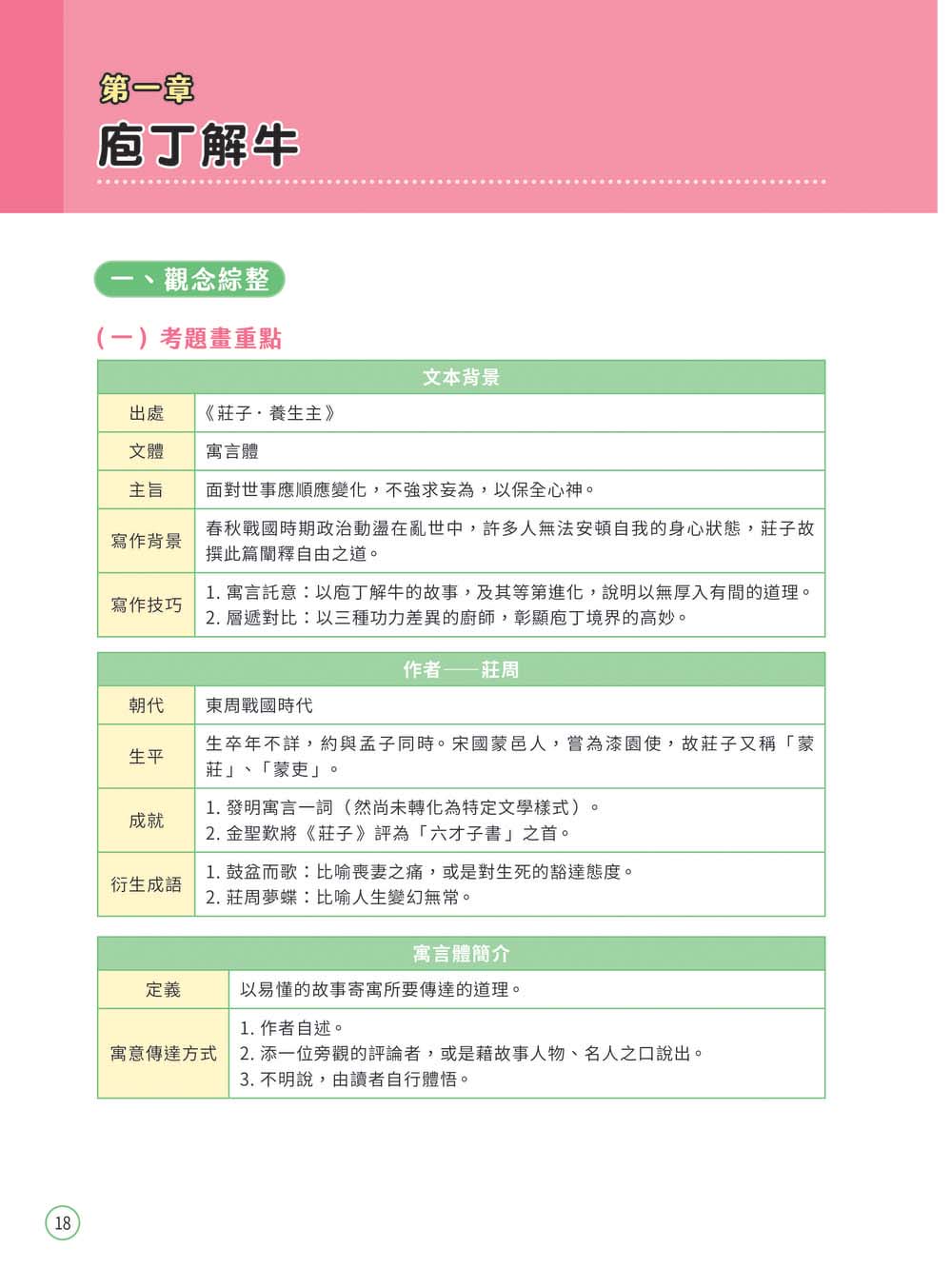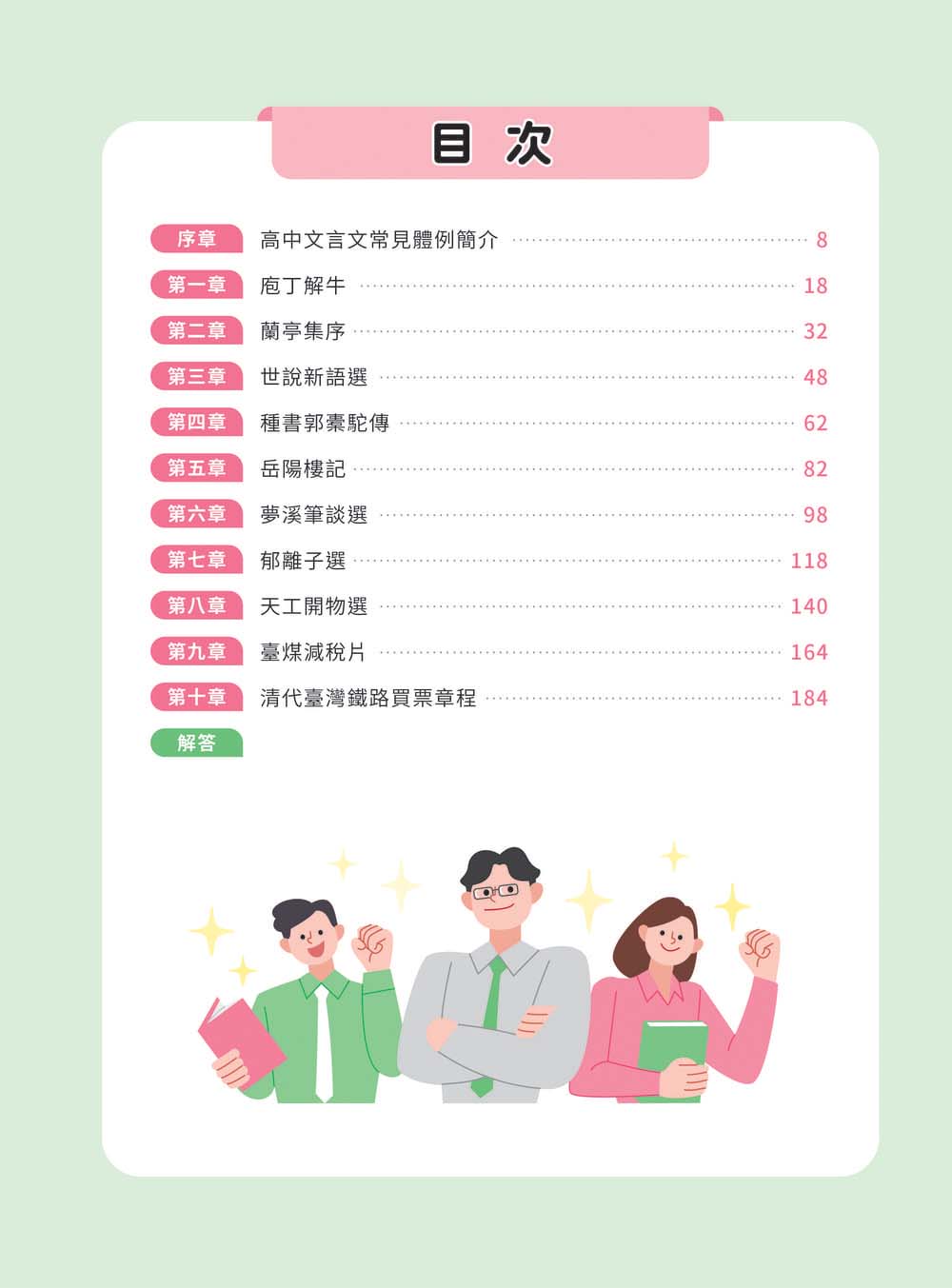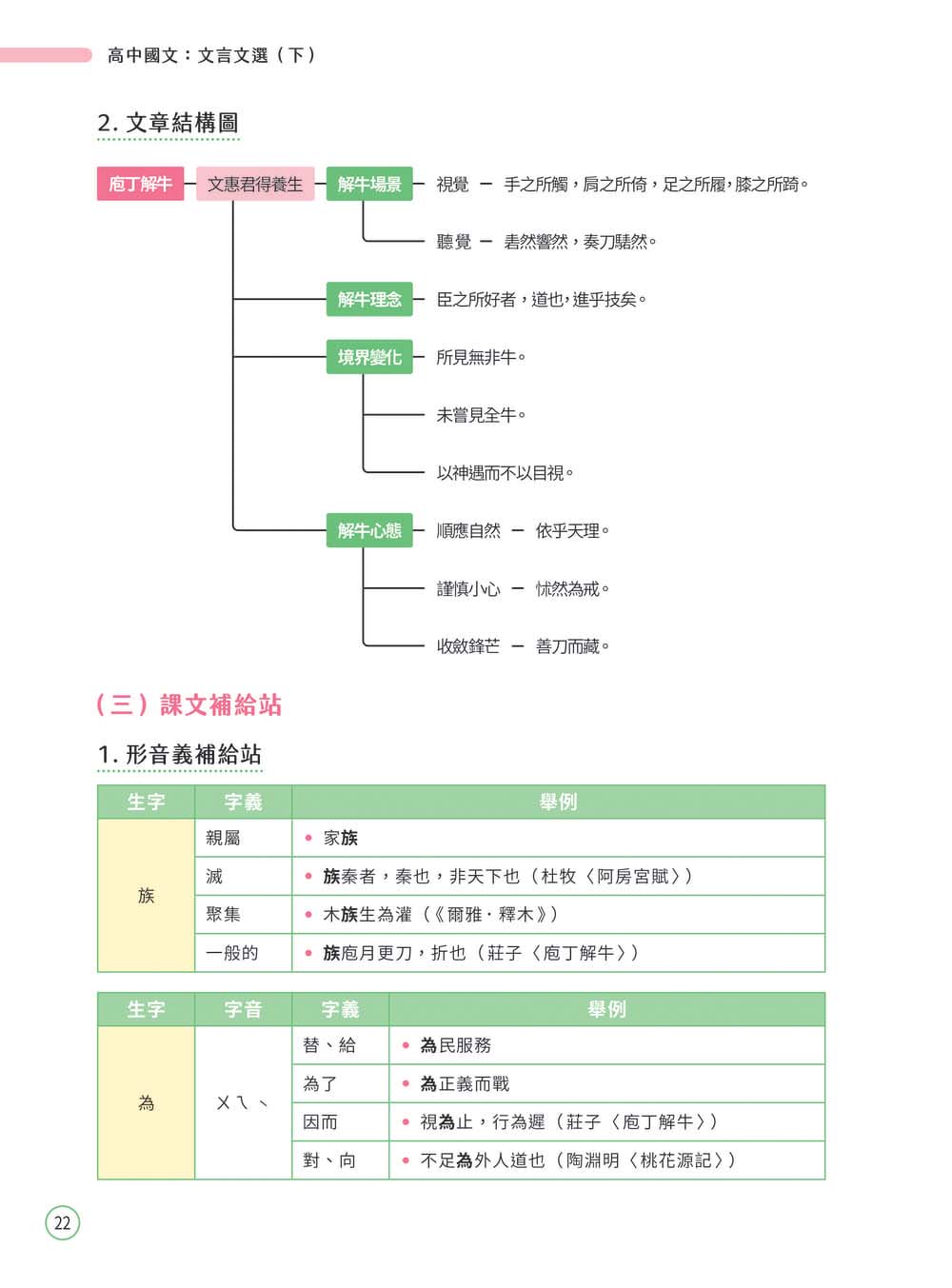 書中「觀念綜整」包含「考題畫重點」、「文本領航員」、「課文結構圖」以及「牛刀小試」,其中文本領航員的課文分析,從字詞解釋、文句修辭及段落解釋,動用各項文本剖析工具切入經典文言文篇章,讓學生從背景介紹、課文理解到打鐵趁熱的複習試題,一氣呵成。