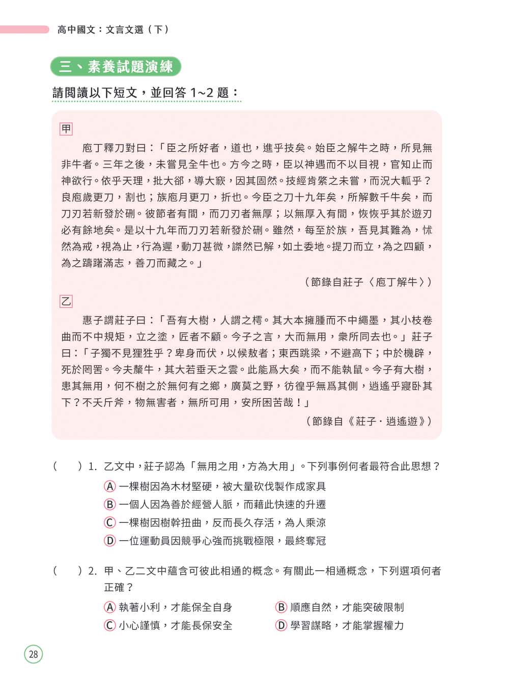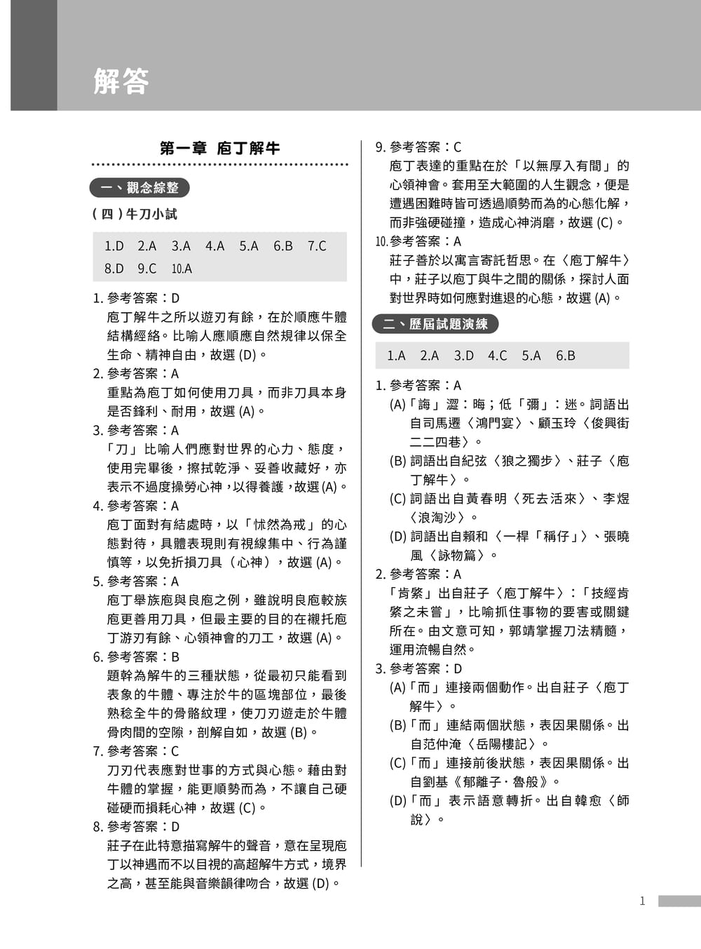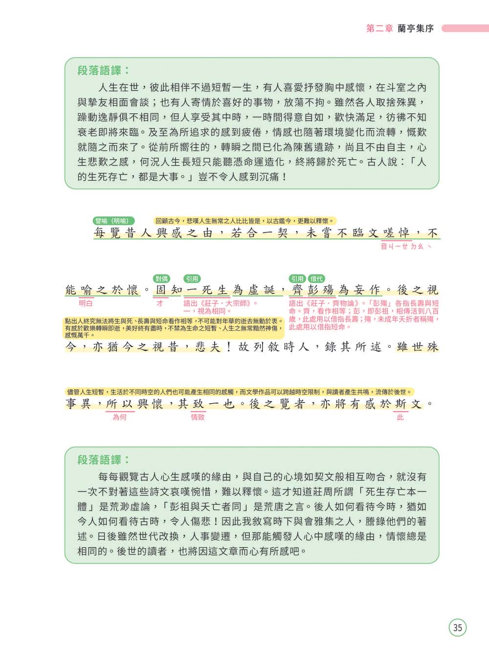 書中「觀念綜整」包含「考題畫重點」、「文本領航員」、「課文結構圖」以及「牛刀小試」,其中文本領航員的課文分析,從字詞解釋、文句修辭及段落解釋,動用各項文本剖析工具切入經典文言文篇章,讓學生從背景介紹、課文理解到打鐵趁熱的複習試題,一氣呵成。