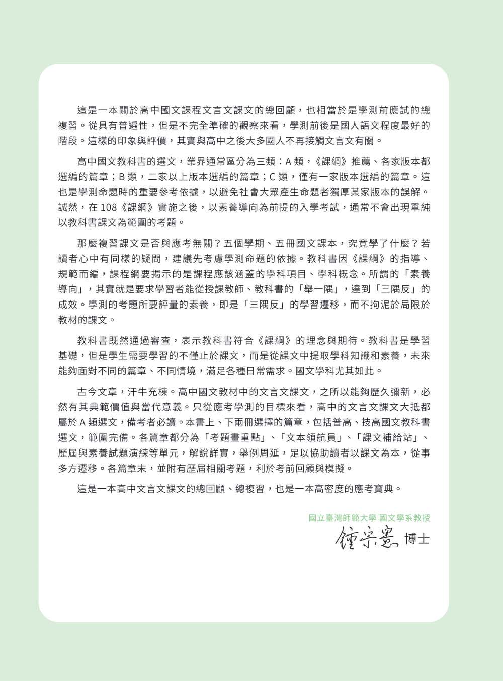 依據高中國文課程單元架構編排,循序整理各單元核心概念,幫助學生建立完整且清晰的知識脈絡。內容除重點整理外,亦提供補充說明與範例解析,並透過「文本領航員」與「牛刀小試」的設計,協助學生同時以文字細究與圖像化理解方式鳥瞰全文架構,並即時檢核學習成果,強化理解與應用能力。