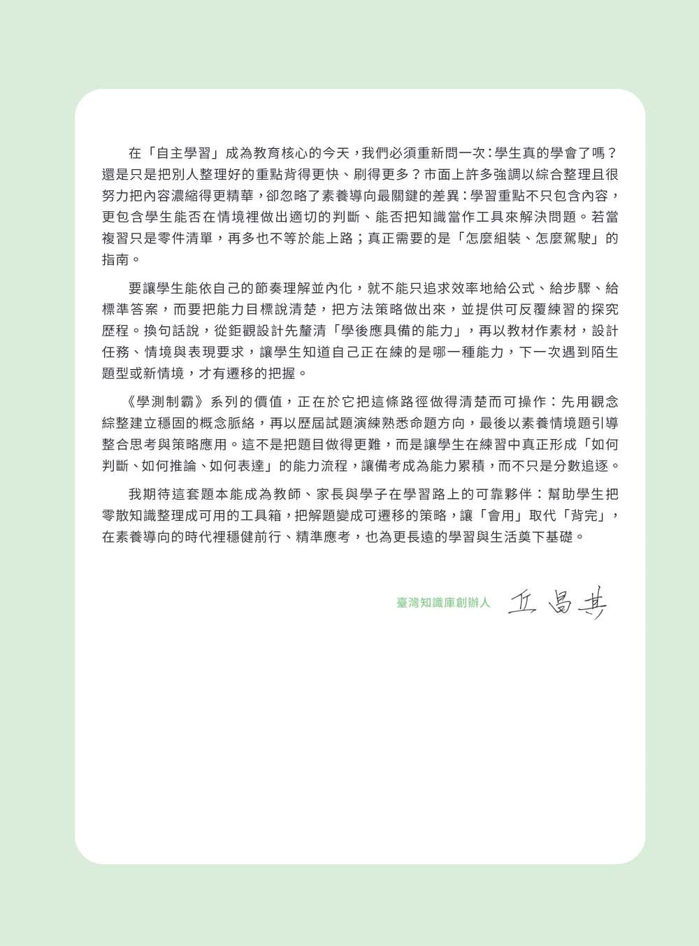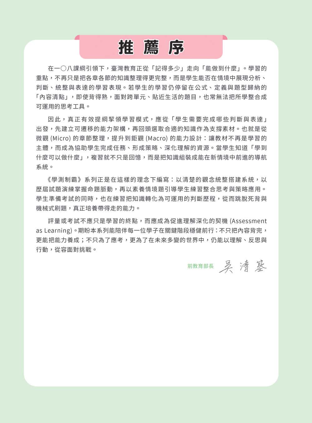 本系列書籍未來將搭配影音線上課程,特別召集擁有多年教學經驗的教師錄製線上影音課程,精析課綱知識重點、傳授學測解題技巧,用最短的時間高效掌握大考核心。