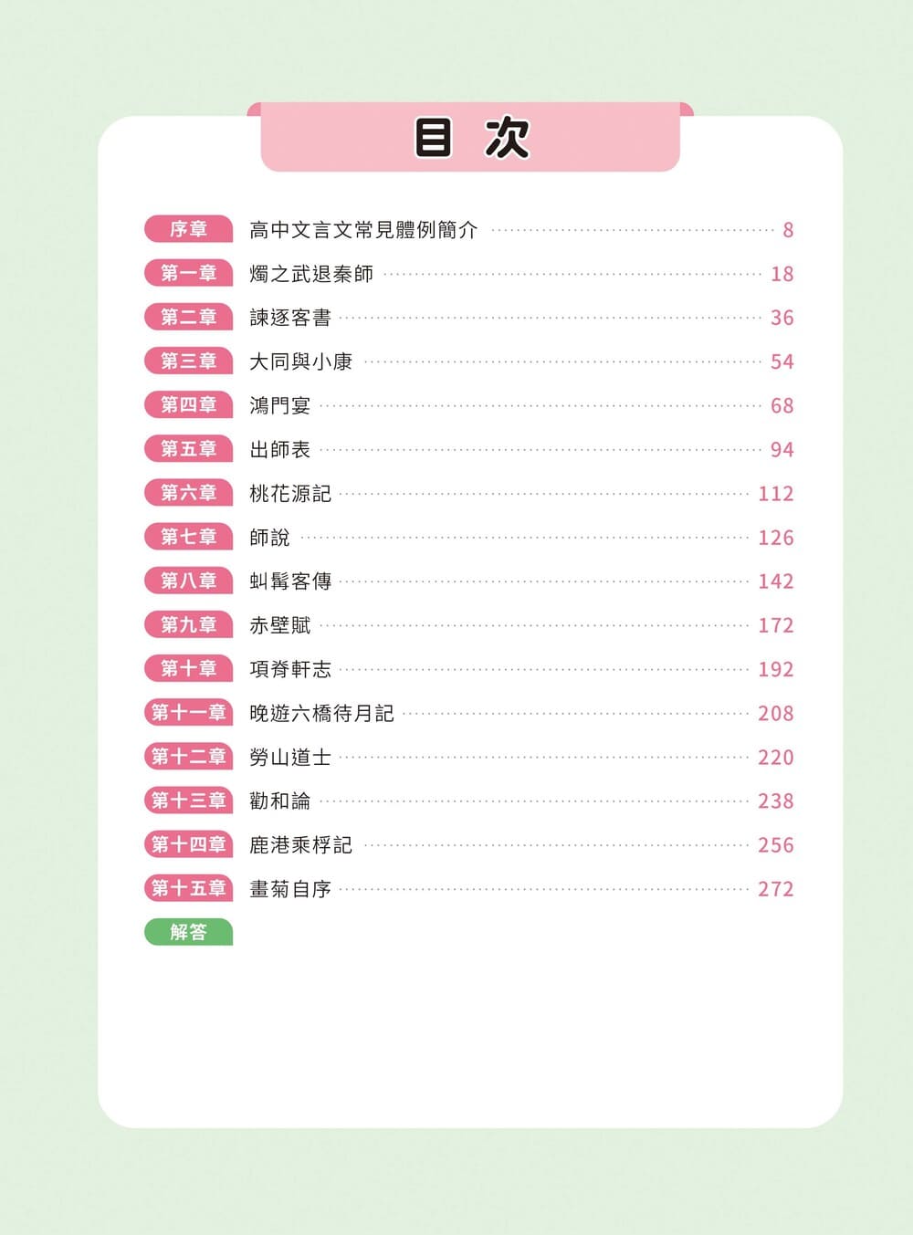 書中「觀念綜整」包含「考題畫重點」、「文本領航員」、「課文結構圖」以及「牛刀小試」,其中文本領航員的課文分析,從字詞解釋、文句修辭及段落解釋,動用各項文本剖析工具切入經典文言文篇章,讓學生從背景介紹、課文理解到打鐵趁熱的複習試題,一氣呵成。