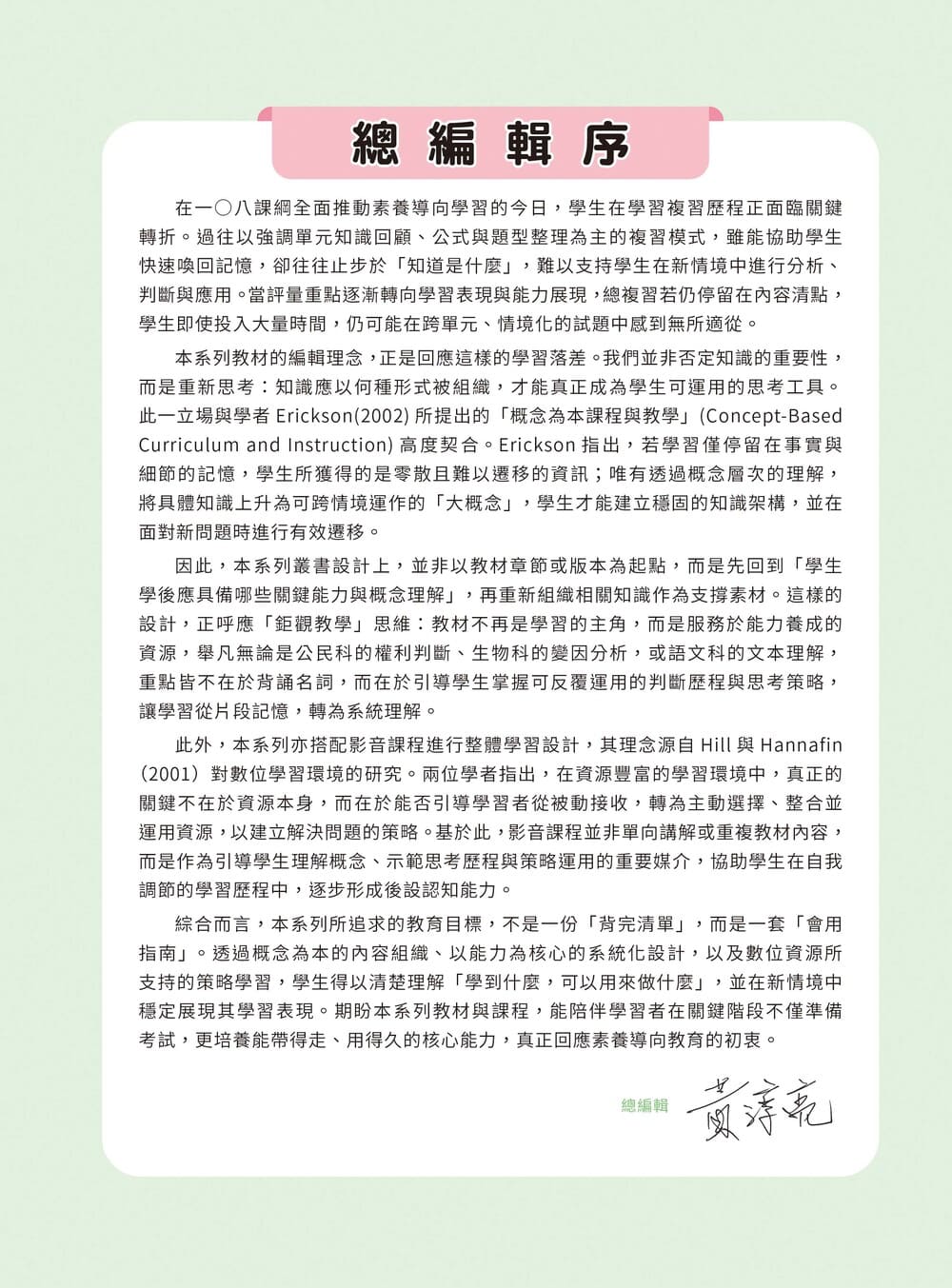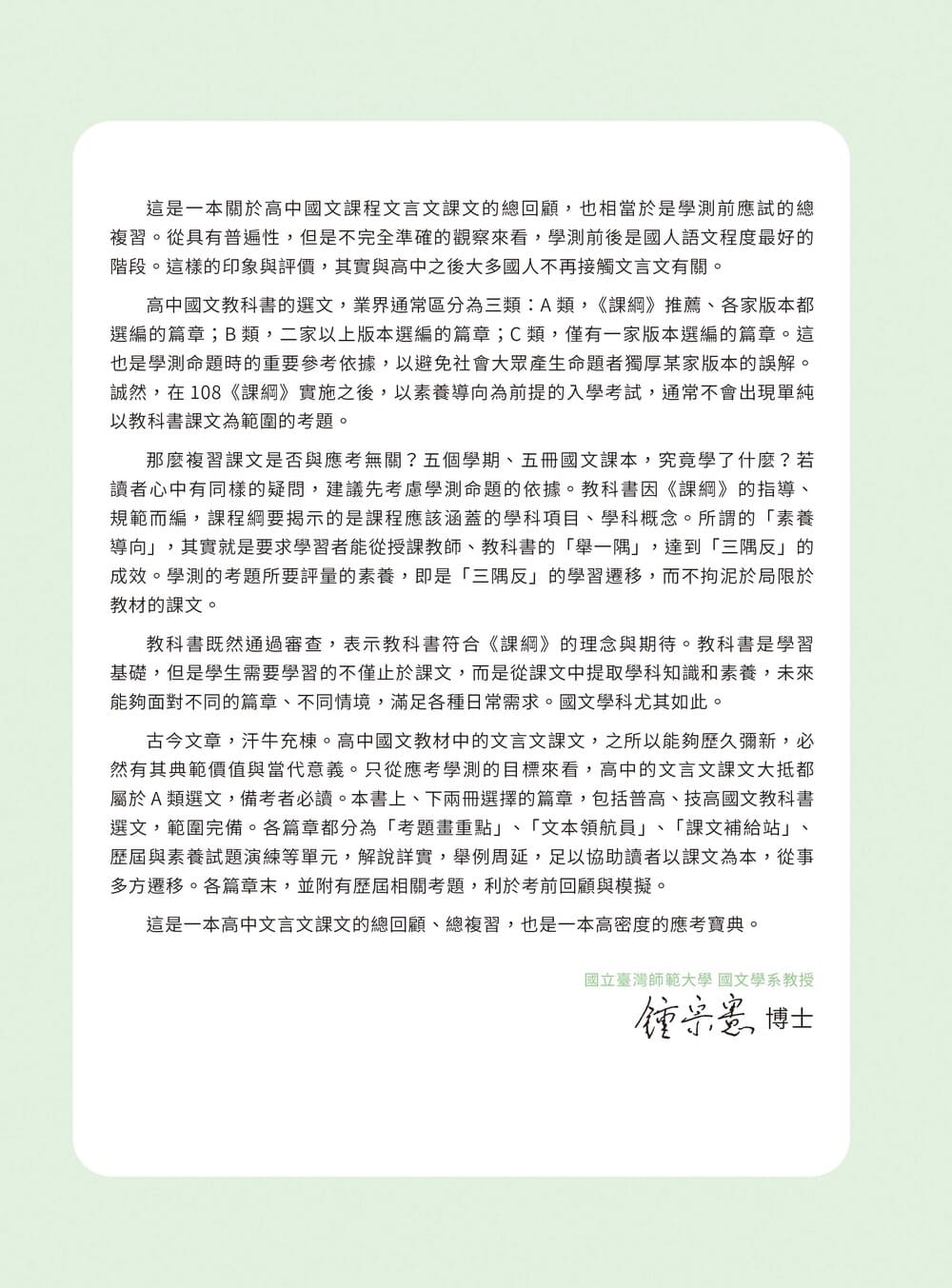 依據高中國文課程單元架構編排,循序整理各單元核心概念,幫助學生建立完整且清晰的知識脈絡。內容除重點整理外,亦提供補充說明與範例解析,並透過「文本領航員」與「牛刀小試」的設計,協助學生同時以文字細究與圖像化理解方式鳥瞰全文架構,並即時檢核學習成果,強化理解與應用能力。