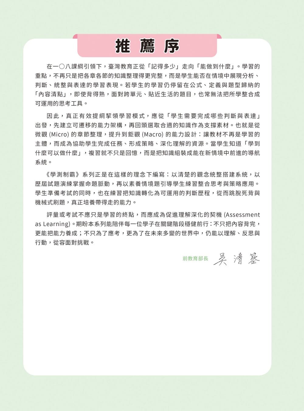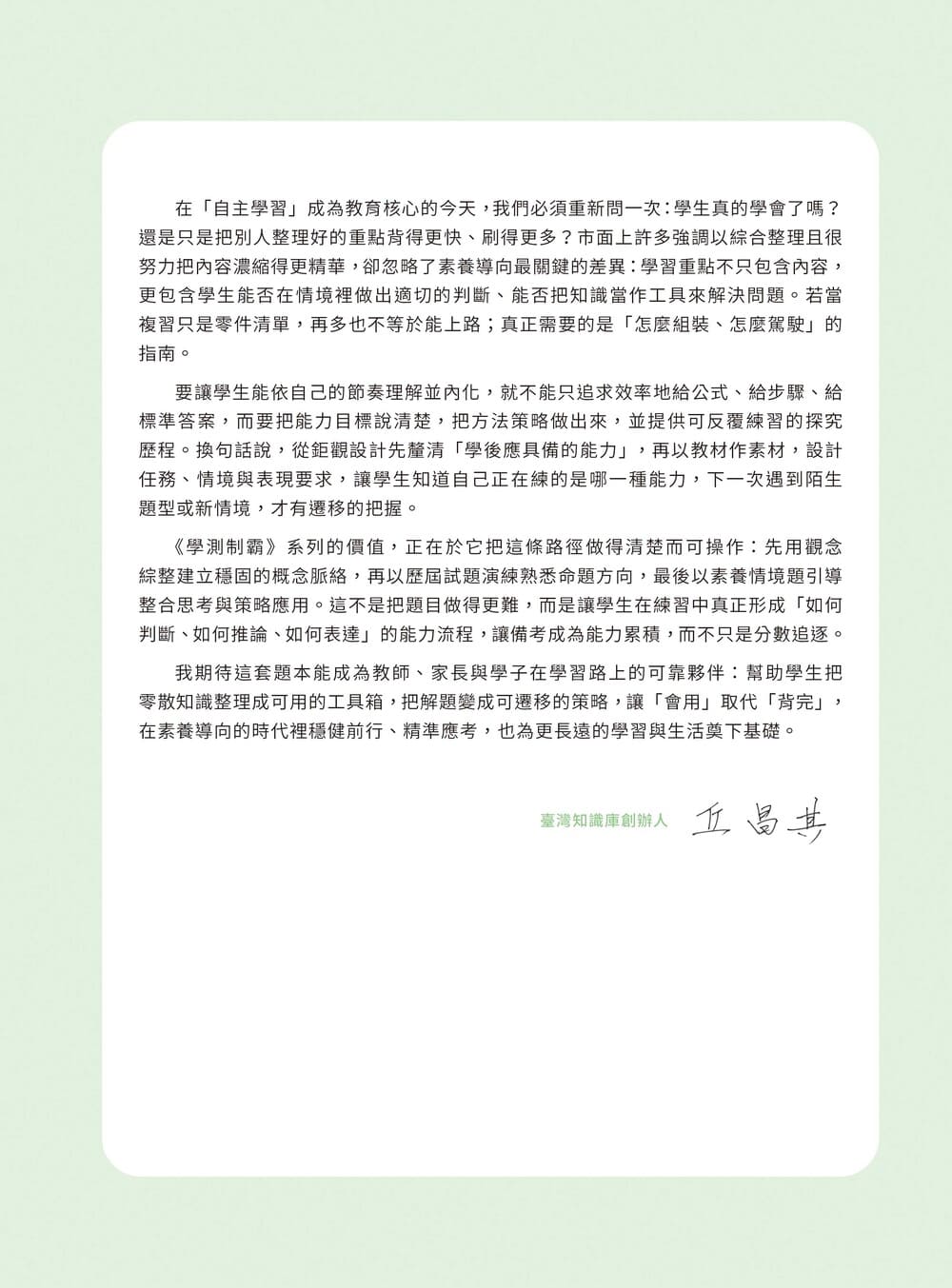 歷屆試題作為練習素材。近年學測命題趨勢以素養導向為主軸,本書選題特別著重情境整合與跨概念應用,讓學生在熟悉大考題型的同時,也能掌握最新命題方向與關鍵重點。