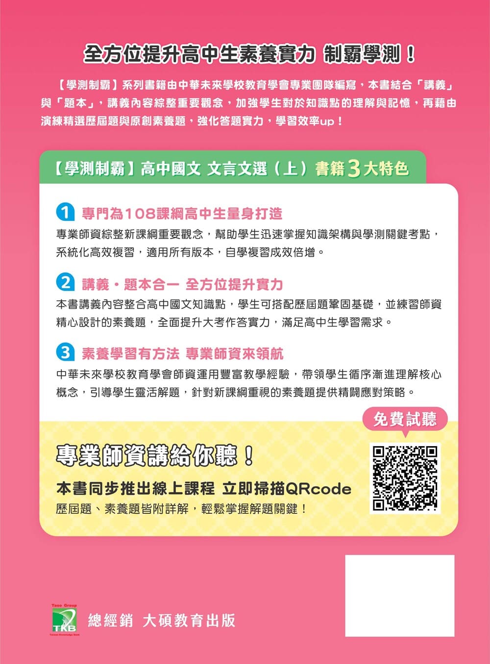 以108課綱內容作為主軸,講述高中國文科文言文的重要背景知識及學測考點,以素養為主軸選題,使學生能輕鬆快速掌握高中國文知識。