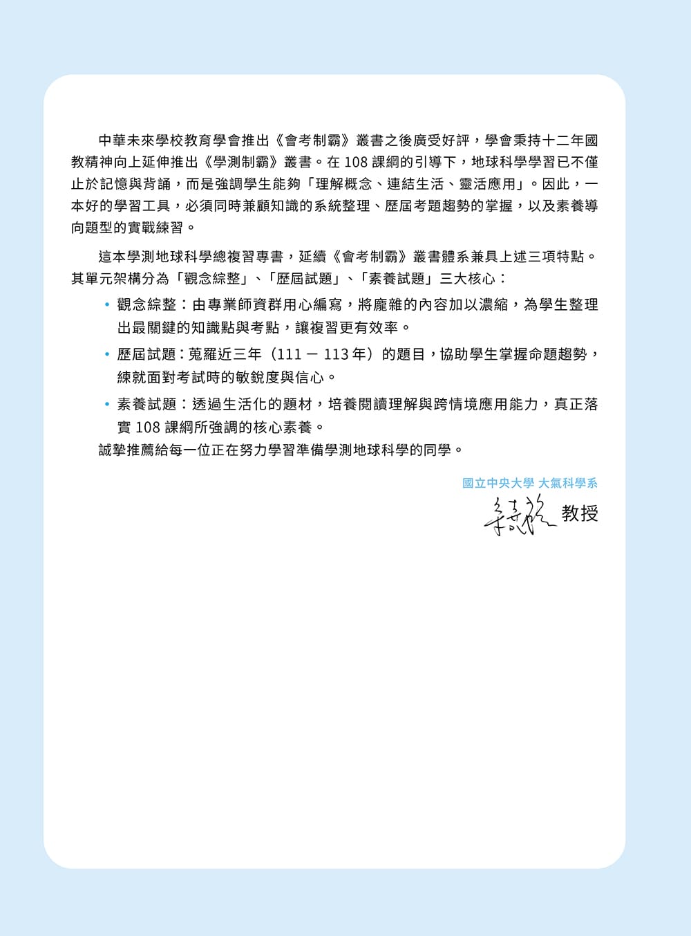 精選近三年學測歷屆試題作為練習素材。近年學測命題趨勢以素養導向為主軸,本書選題特別著重情境整合與跨概念應用,讓學生在熟悉大考題型的同時,也能掌握最新命題方向與關鍵重點。